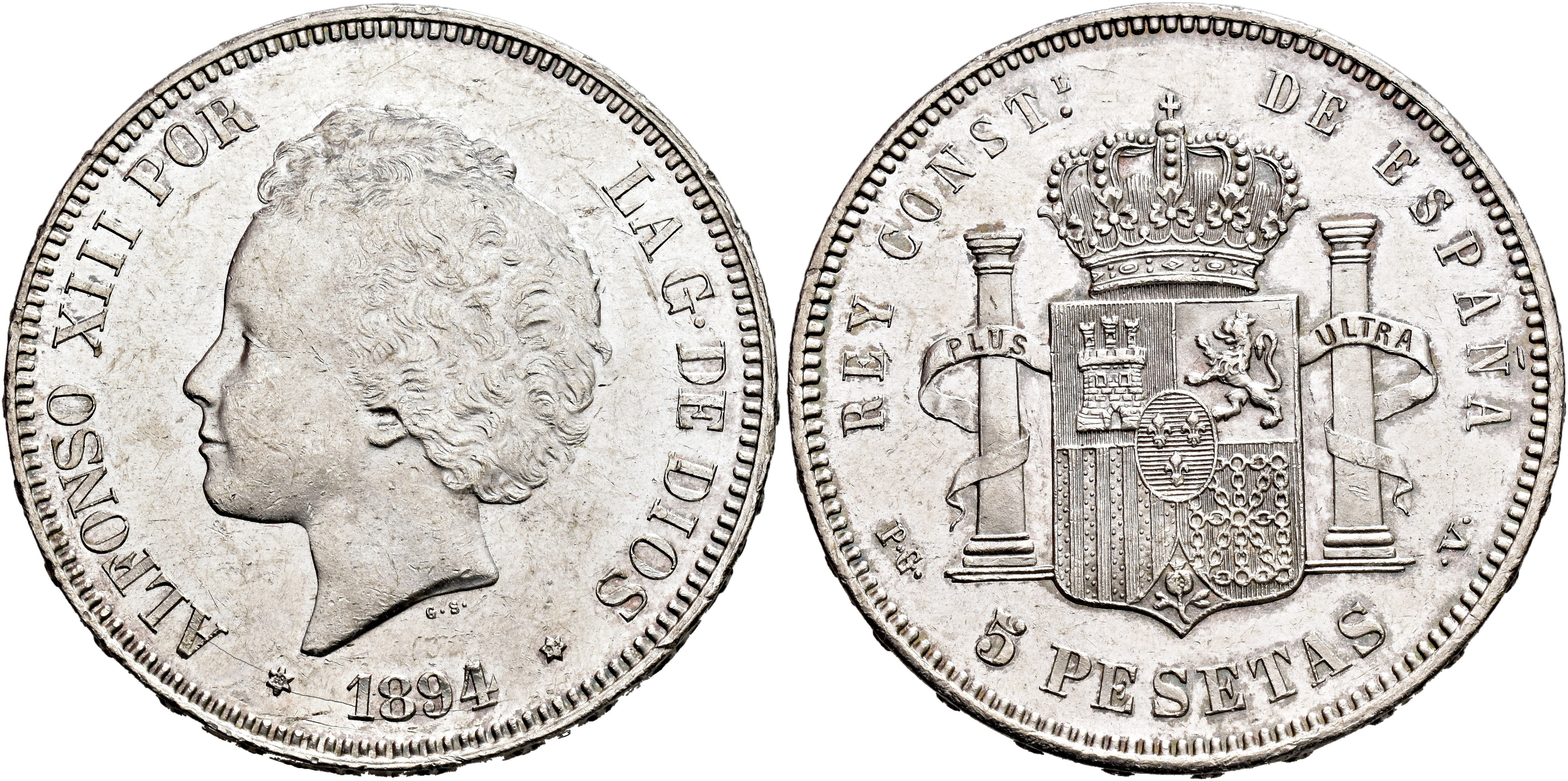 ALFONSO XIII. 5 pesetas. 1894*18-94. Madrid. PGV. AR 24,91 g. 37,5 mm. VII-187; AC-104. SC/EBC+.