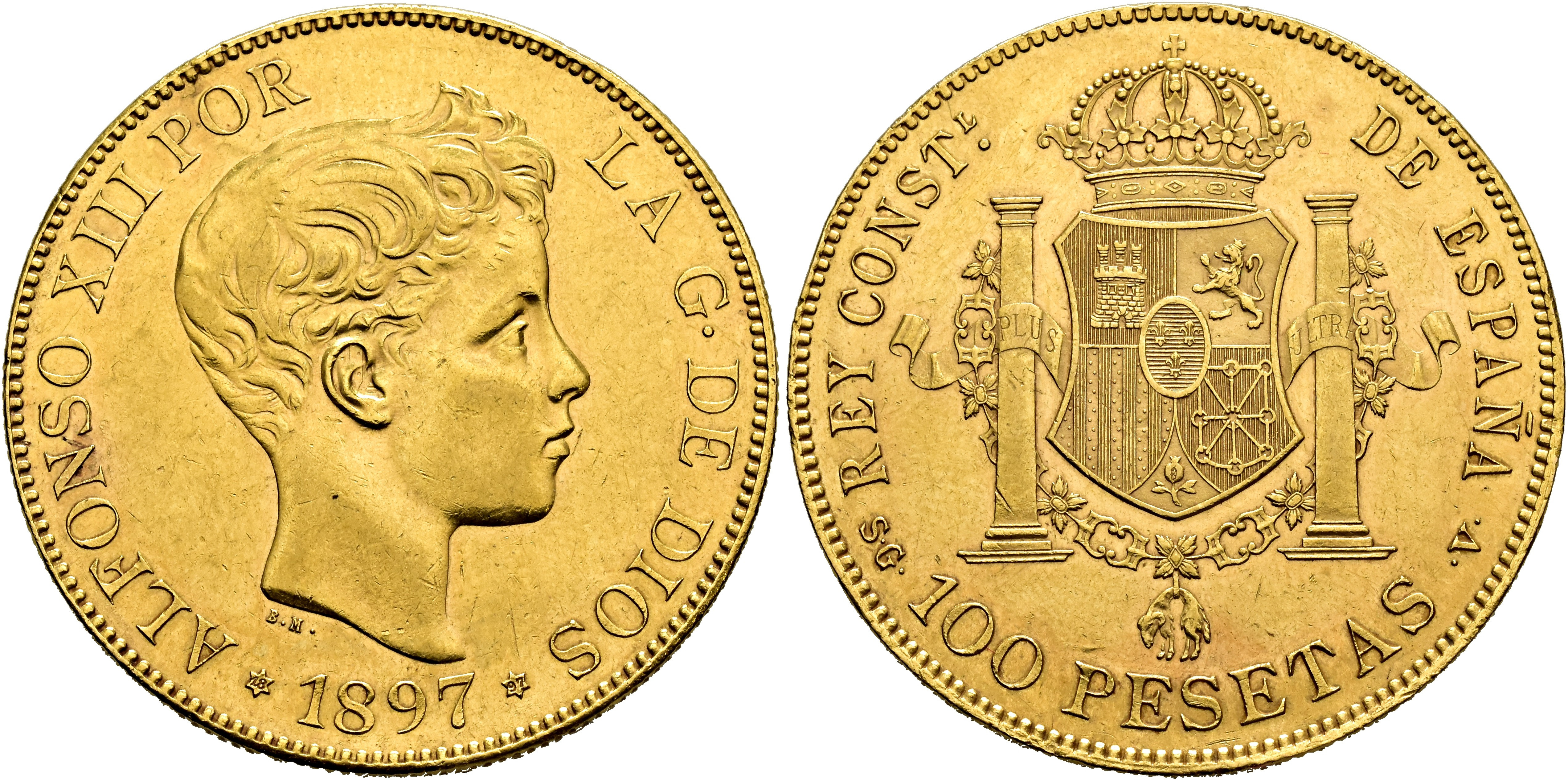 ALFONSO XIII. 100 pesetas. 1897. Madrid. SGV. AU 32,25 g. 34,8 mm. VII-199; AC-119. EBC/EBC-.