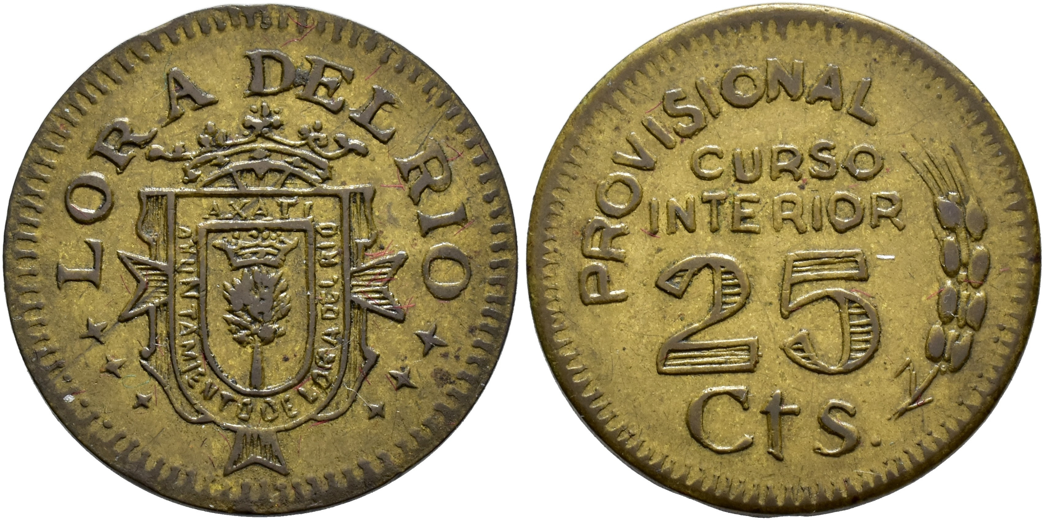 GUERRA CIVIL. Lora del Río. 25 céntimos. S/F. Latón 3,58 g. 23,3 mm. VII-247; AC-44. MBC. Escasa.