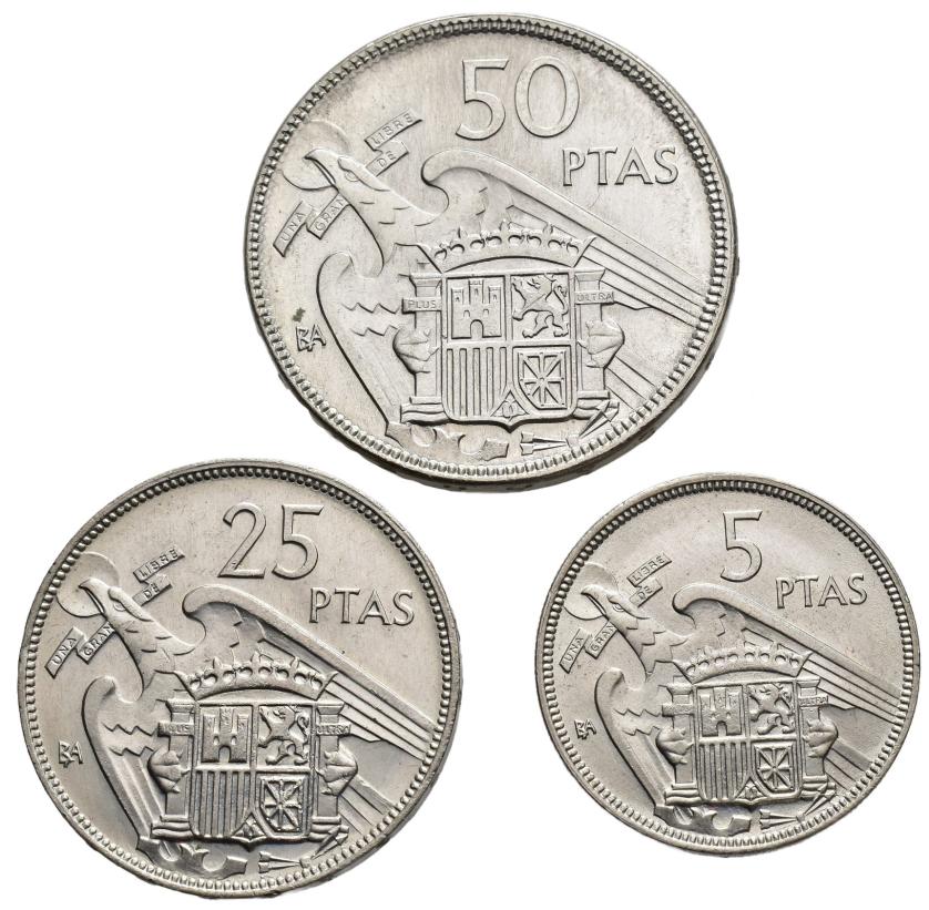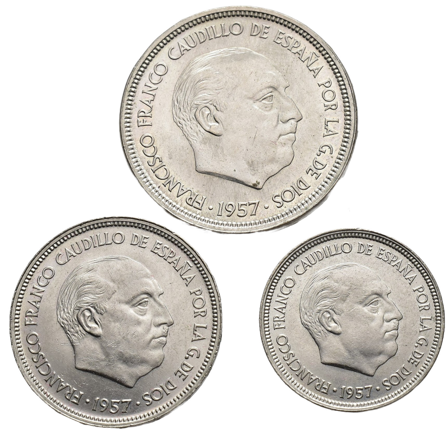 F. FRANCO. Serie I Exposición Iberoamericana de Numismática y Medallística. 5, 25 y 50 pts. 1957. BA en lugar de estrellas. VII-422. SC.