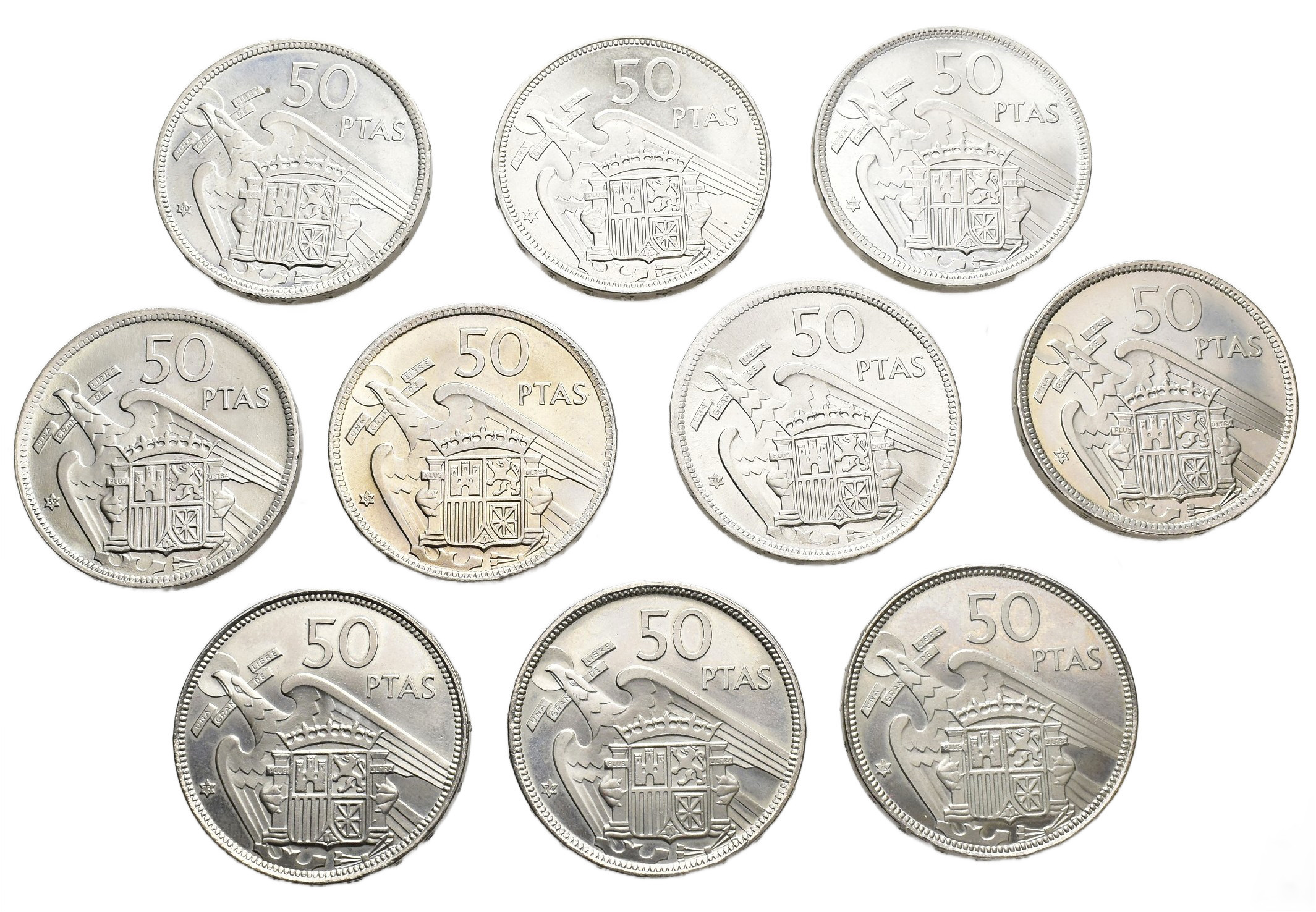 F. FRANCO. Lote de 12 piezas de 50 pesetas: 1957*58, 59, 60, 67, 70, 71, 72, 73, 74 y 75. SC y prueba.