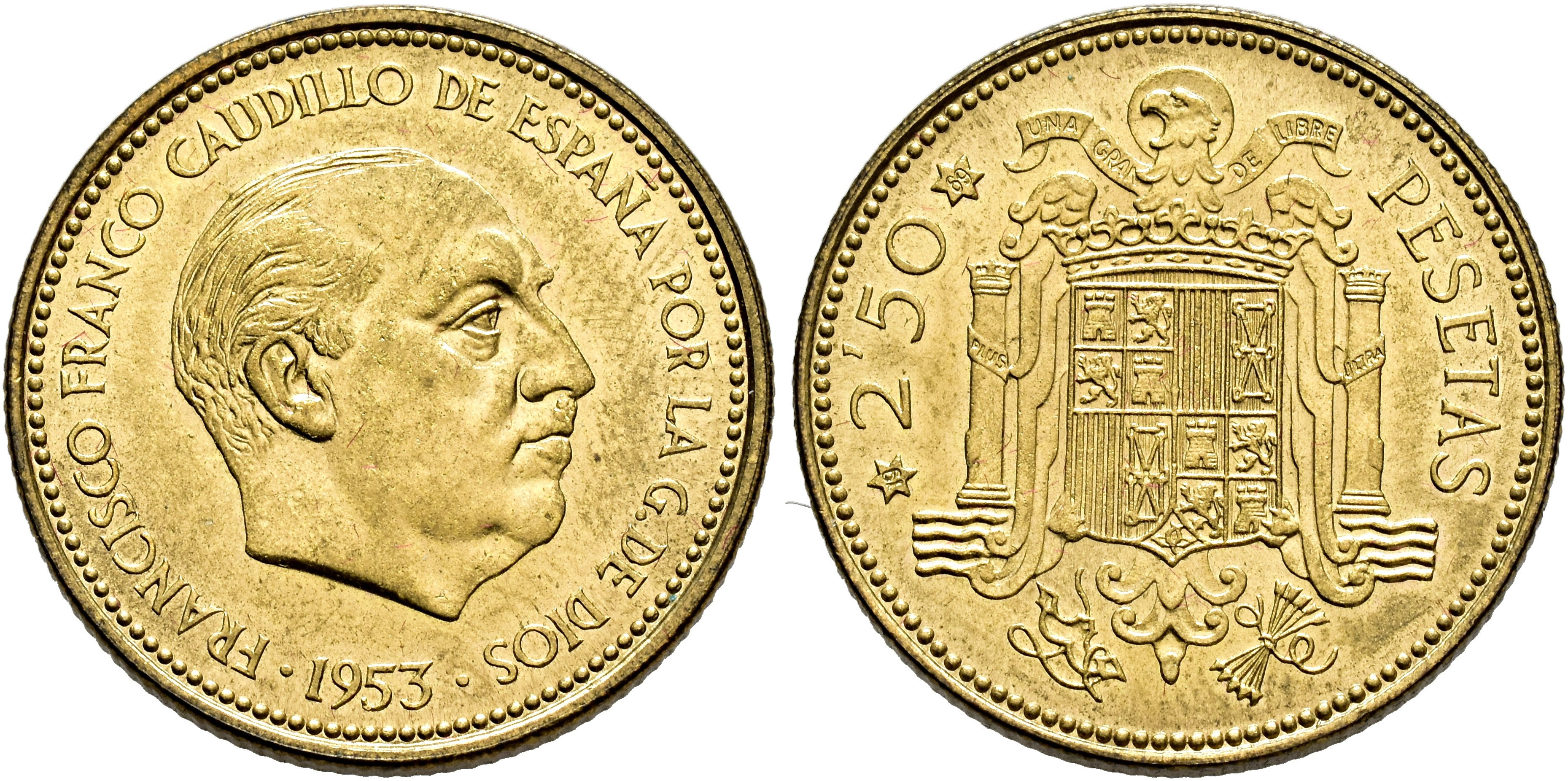 F. FRANCO. 2,5 pesetas. 1953*19-69. CuNi 7,06 g. 25,3 mm. VII-345. Prueba. Rara.