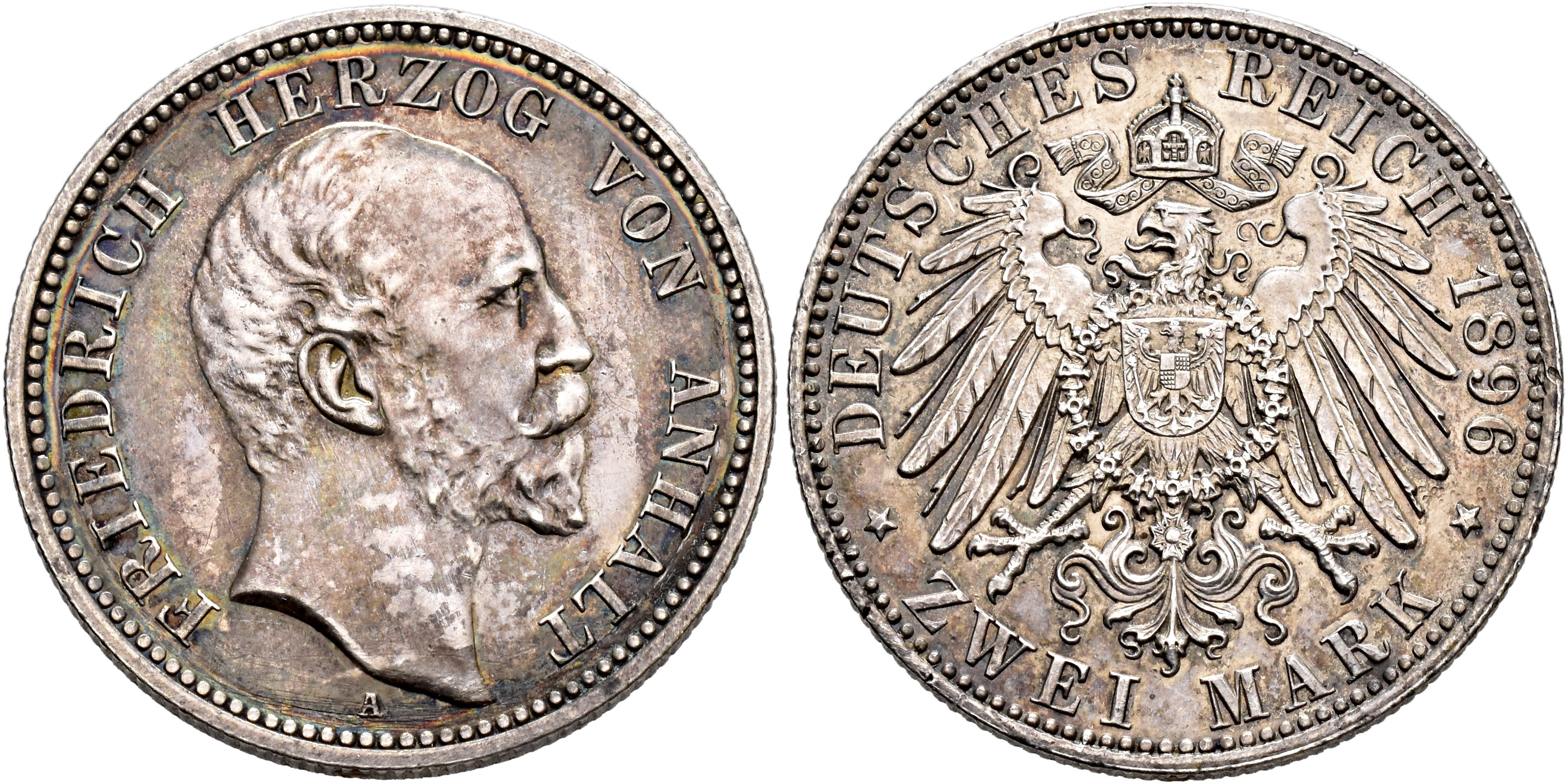 MONEDA EXTRANJERA. ESTADOS ALEMANES Y ALEMANIA. ANHALT. Federico I. 2 marcos. 1896. A. AR 11,09 g. 28 mm. KM-23. EBC-/EBC.