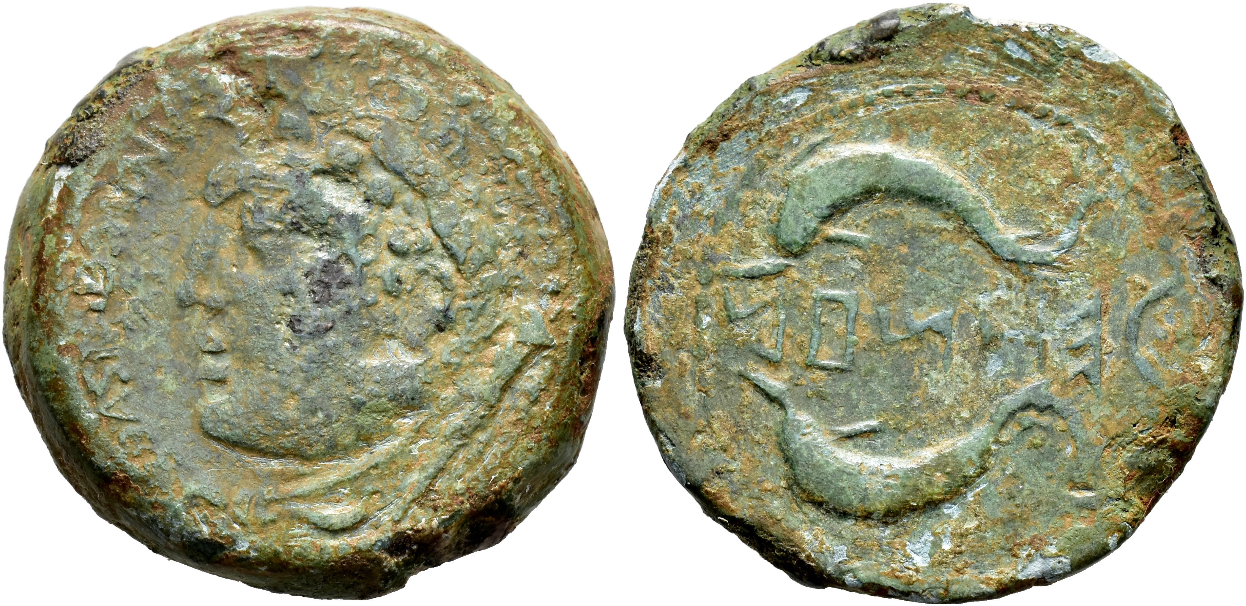 HISPANIA ANTIGUA. KETOVION-SALACIA. Unidad. A/ Cabeza de Melkart con leonté y clava detrás a izq., delante ANDVCEP SISCV (F-(TVL). R/ Dos delfines a izq., en medio entre líneas KeToUION. AE 16,42 g. 28,3 mm. I-1631; ACIP-980. Pátina verde con ligeras erosiones. MBC-. Rarísima.