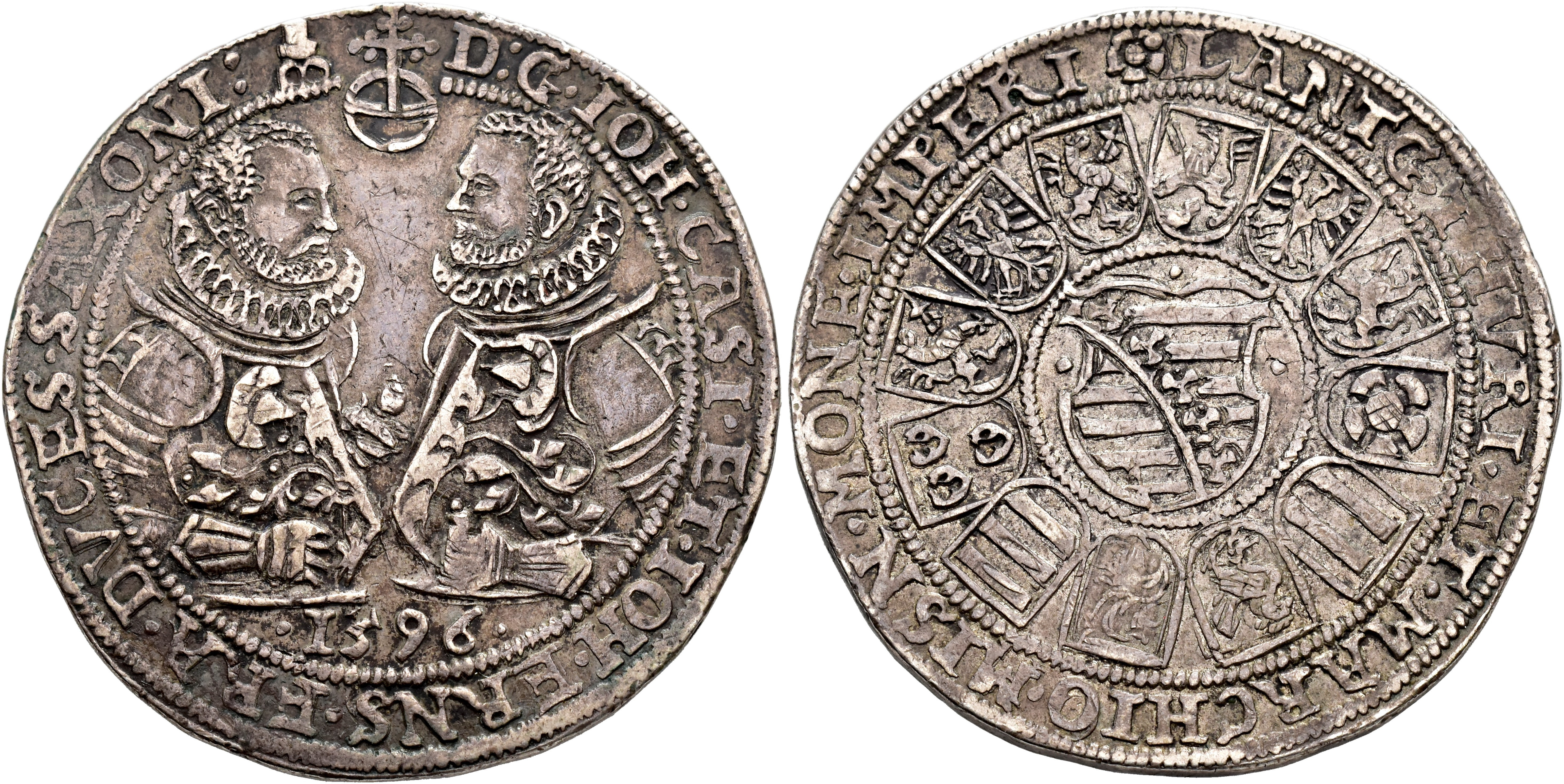 MONEDA EXTRANJERA. ESTADOS ALEMANES Y ALEMANIA. SAJONIA-COBURGO. Juan Casimiro y Juan Ernesto. Tálero. 1596. AR 29,06 g. 40,3 mm. Dav.-9758. Pequeñas marcas. MBC.
