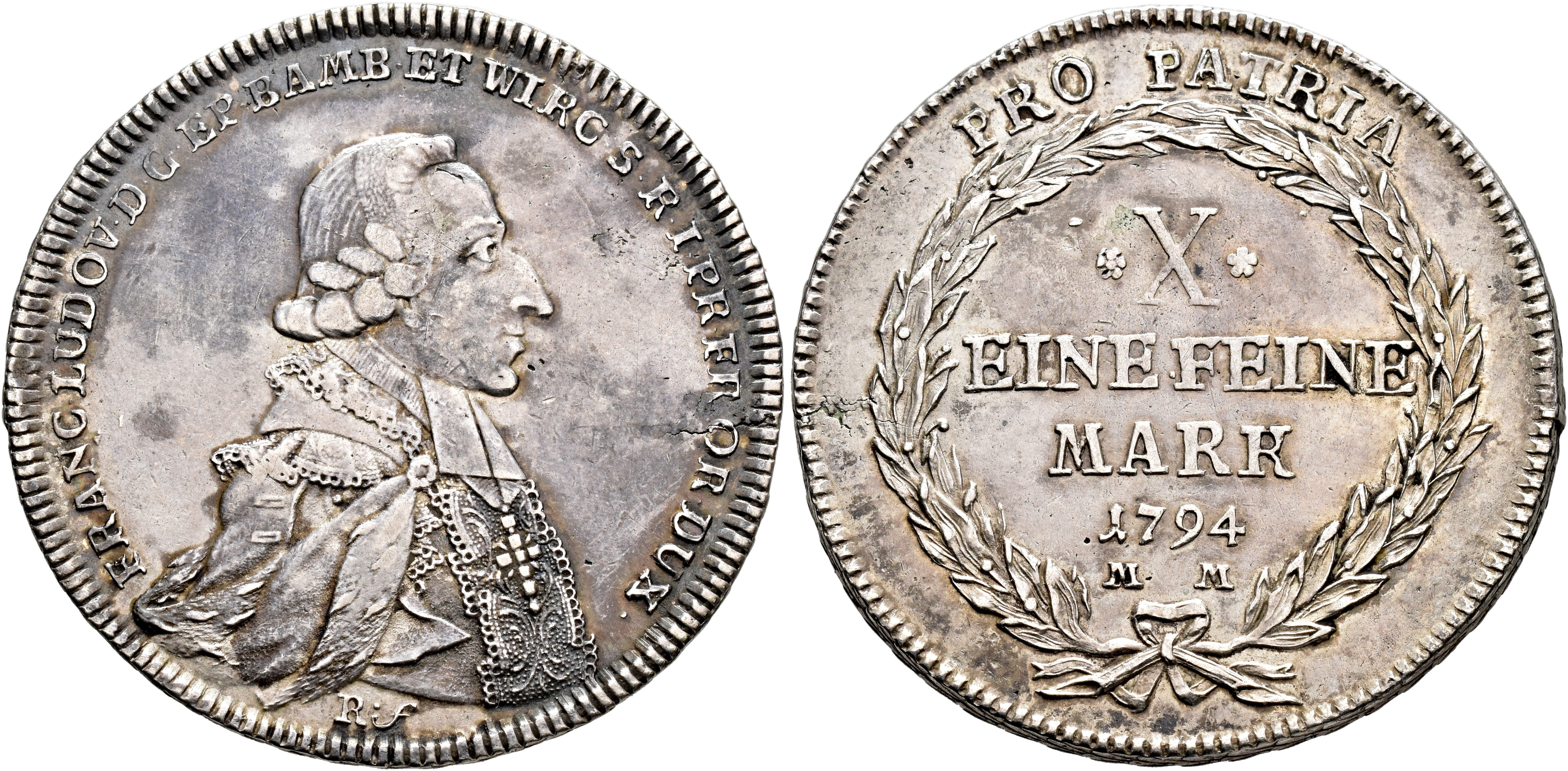 MONEDA EXTRANJERA. ESTADOS ALEMANES Y ALEMANIA. OBISPADO DE WÜRZBURGO. Francisco Luis. Tálero. 1794. MM. AR 27,78 g. 41,2 mm. Dav.-2911. Oxidaciones limpiadas. MBC+/MBC.