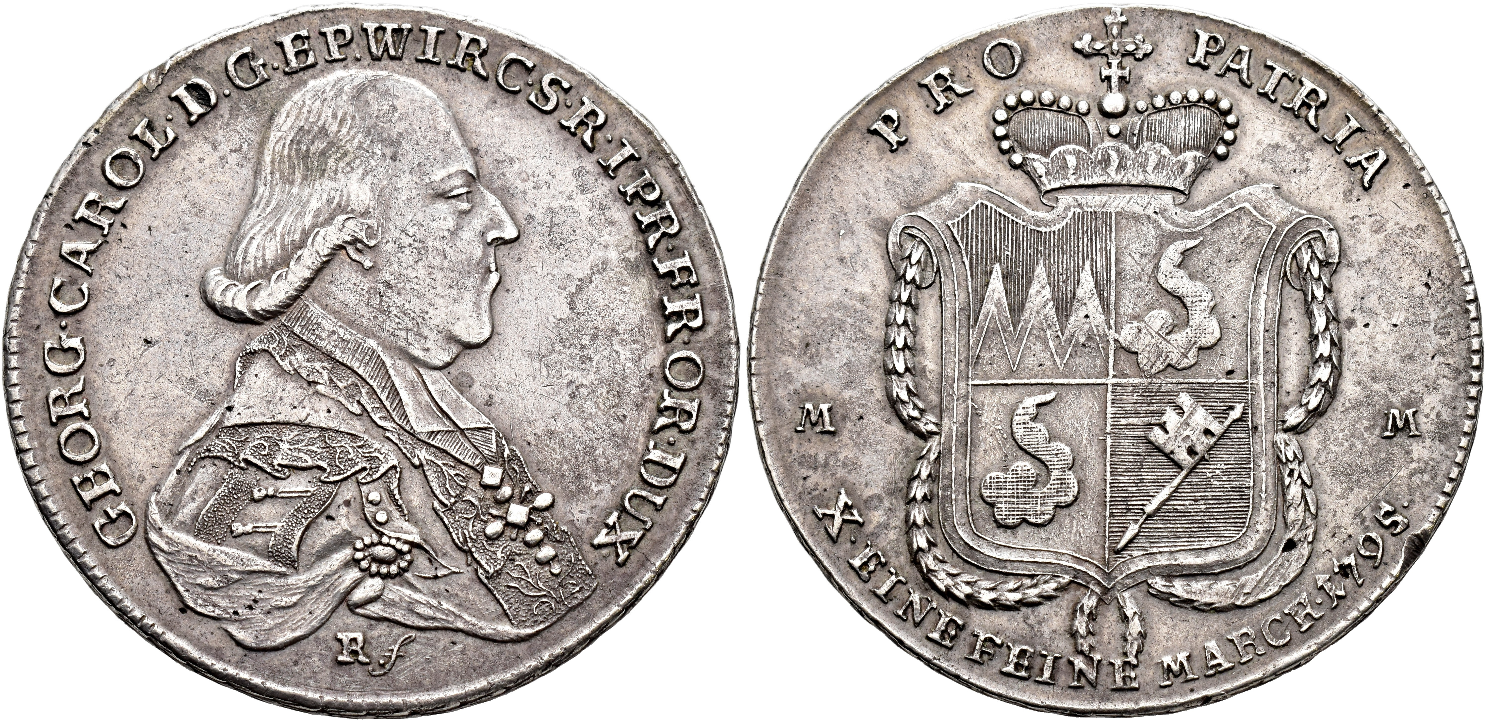 MONEDA EXTRANJERA. ESTADOS ALEMANES Y ALEMANIA. OBISPADO DE WÜRZBURGO. Jorge Carlos. Tálero. 1795. M-M. AR 27,61 g. 39,8 mm. Dav.-2913. Pequeñas erosiones y 2 golpecitos en gráfilas. MBC.