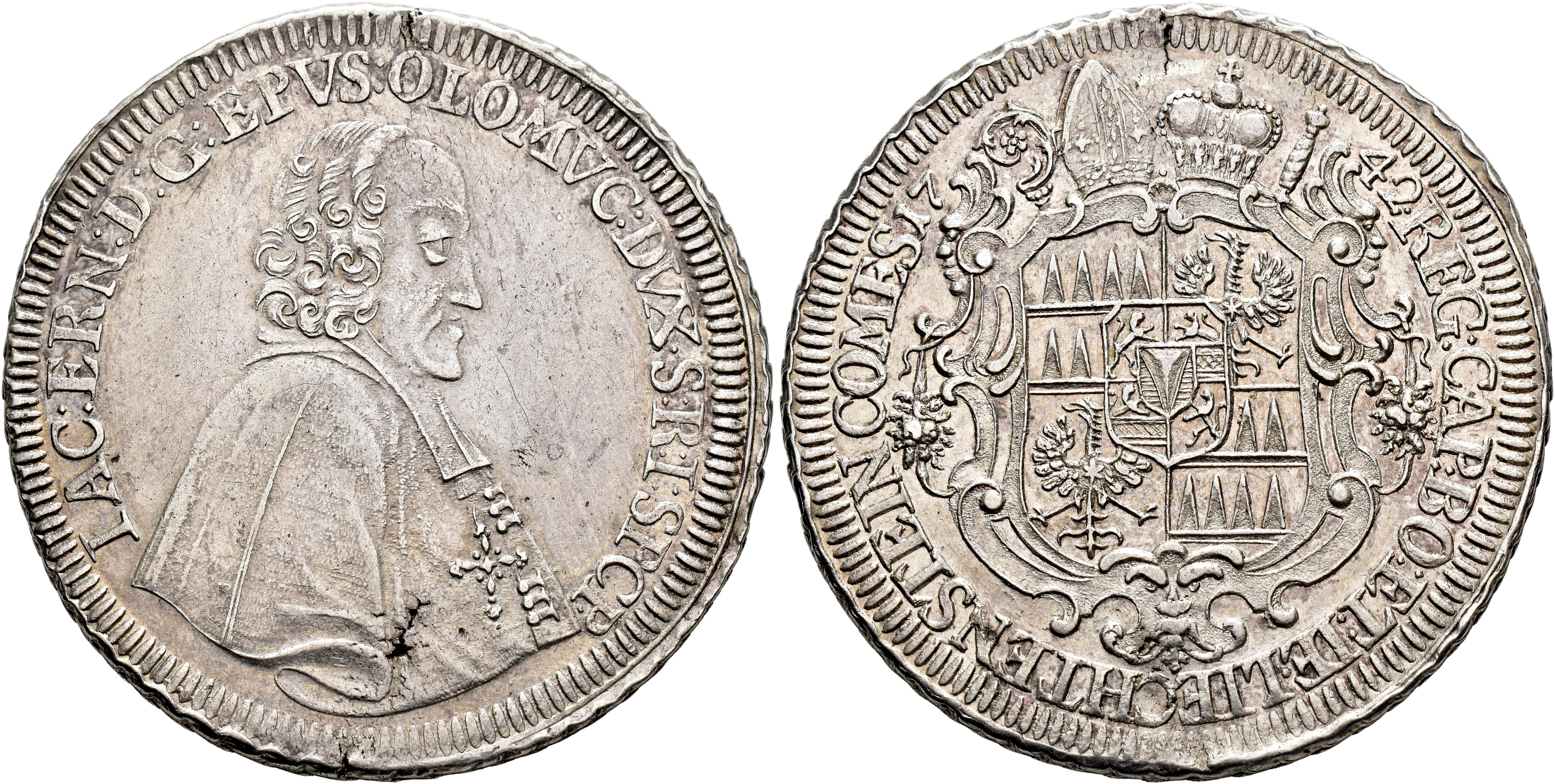 MONEDA EXTRANJERA. ESTADOS AUSTRIACOS Y AUSTRIA. OLMUTZ. Obispo Jacobo Ernesto de Liechstenstein. Tálero. 1742. AR 28,97 g. 44 mm. Dav.-1230. Pequeña grieta. EBC-.