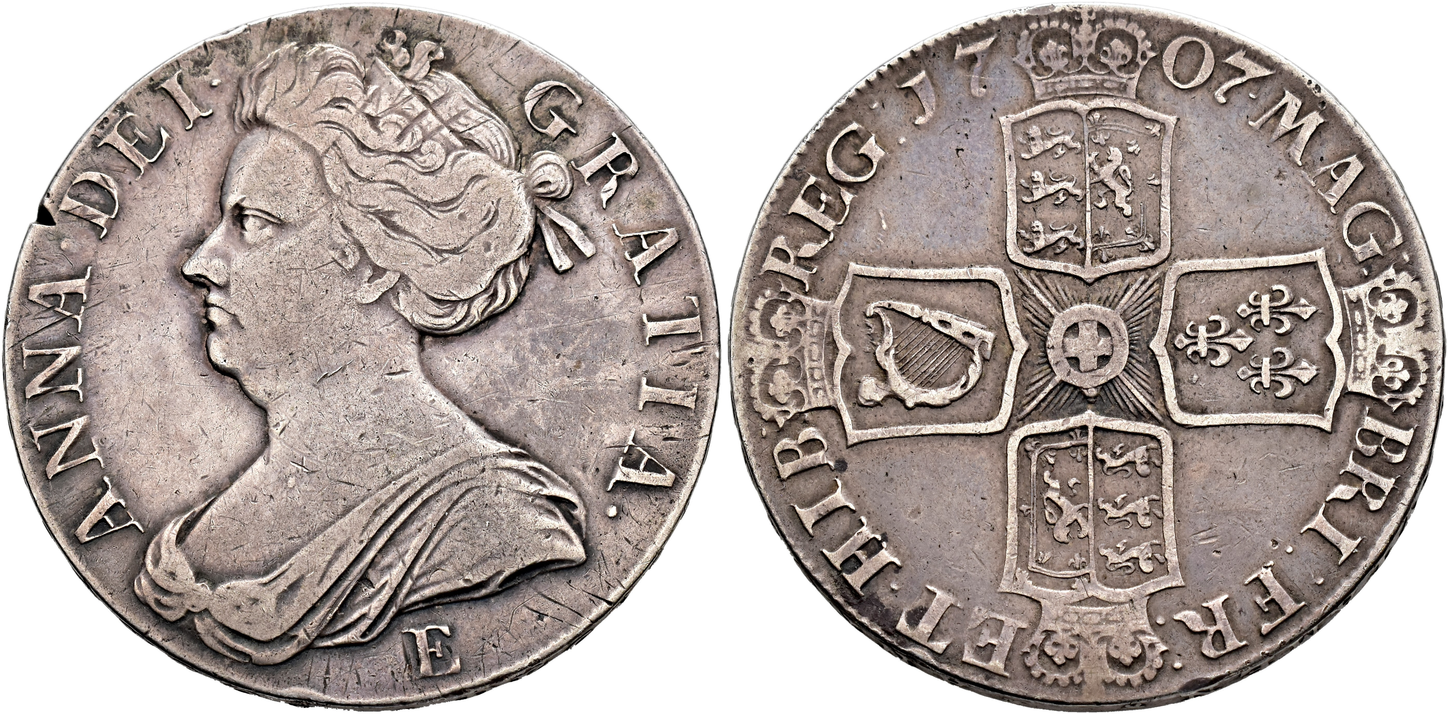 MONEDA EXTRANJERA. GRAN BRETAÑA. Ana. Corona. 1707. E. Sexto. AR 29,86 g. 38 mm. Spink-3600. Muesca en gráfila. Rayitas. MBC-/MBC.