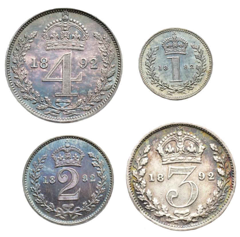 MONEDA EXTRANJERA. GRAN BRETAÑA. Victoria. Serie Maundy. 1892. 1, 2, 3 y 4 peniques. Una MBC y 3 SC.