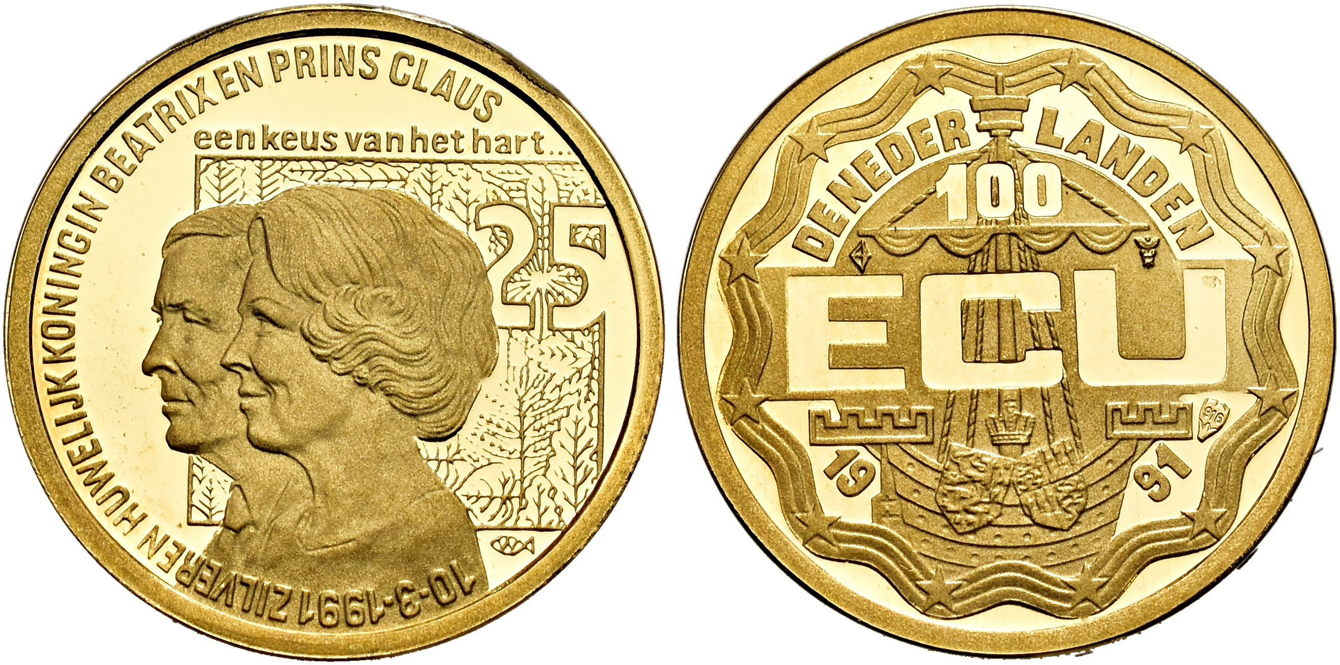 MONEDA EXTRANJERA. HOLANDA. 100 ecu. 1991. AU 3,36 (0.916) g. 18 mm. KM-X38. Prueba. En estuche.