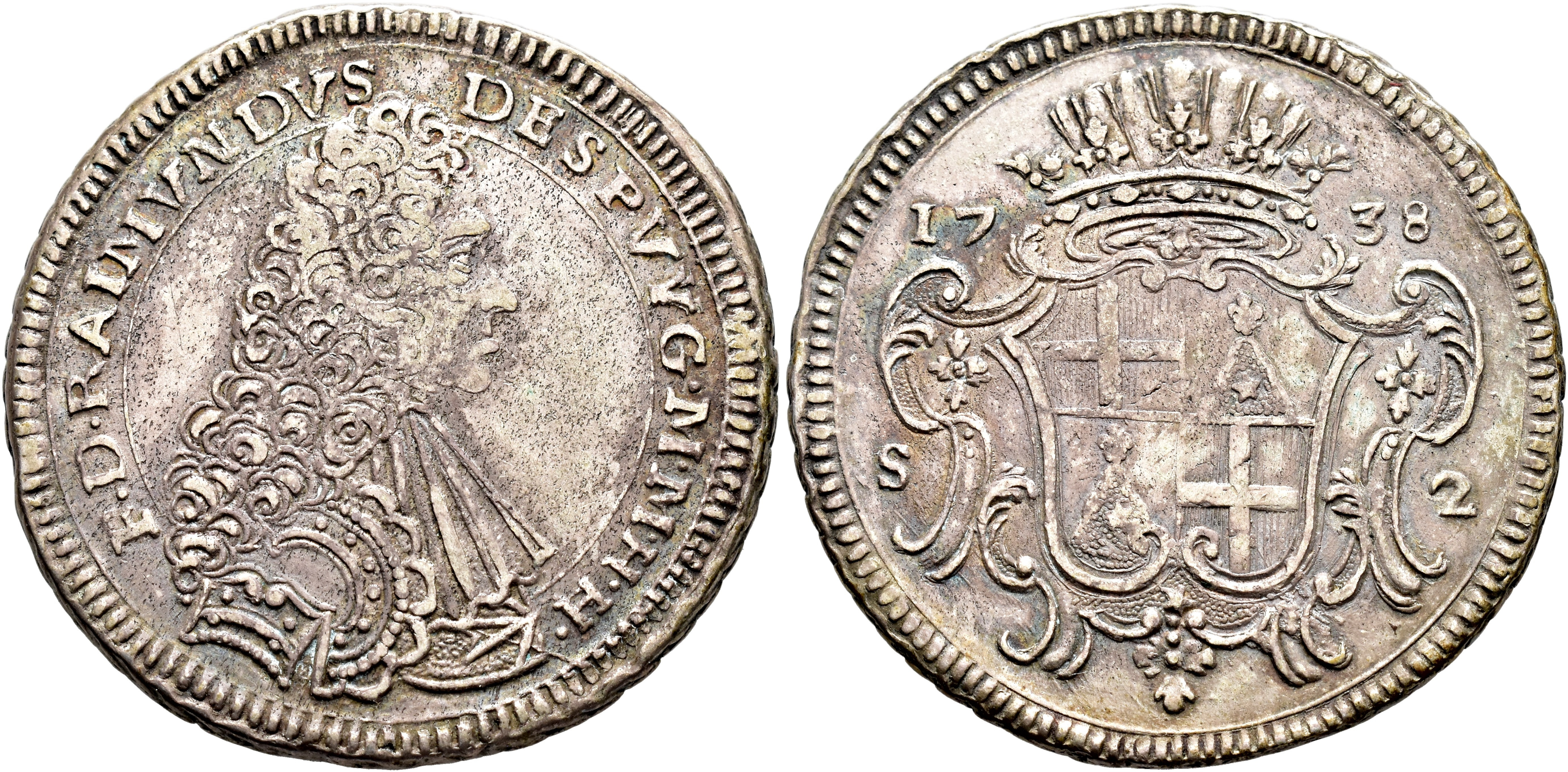 MONEDA EXTRANJERA. MALTA. ORDEN DE MALTA. Raymond Despuig. 2 escudos. 1738. AR 24,4 g. 38,7 mm. Dav.-1598; KM-204.2. Pequeñas erosiones. MBC-/MBC.