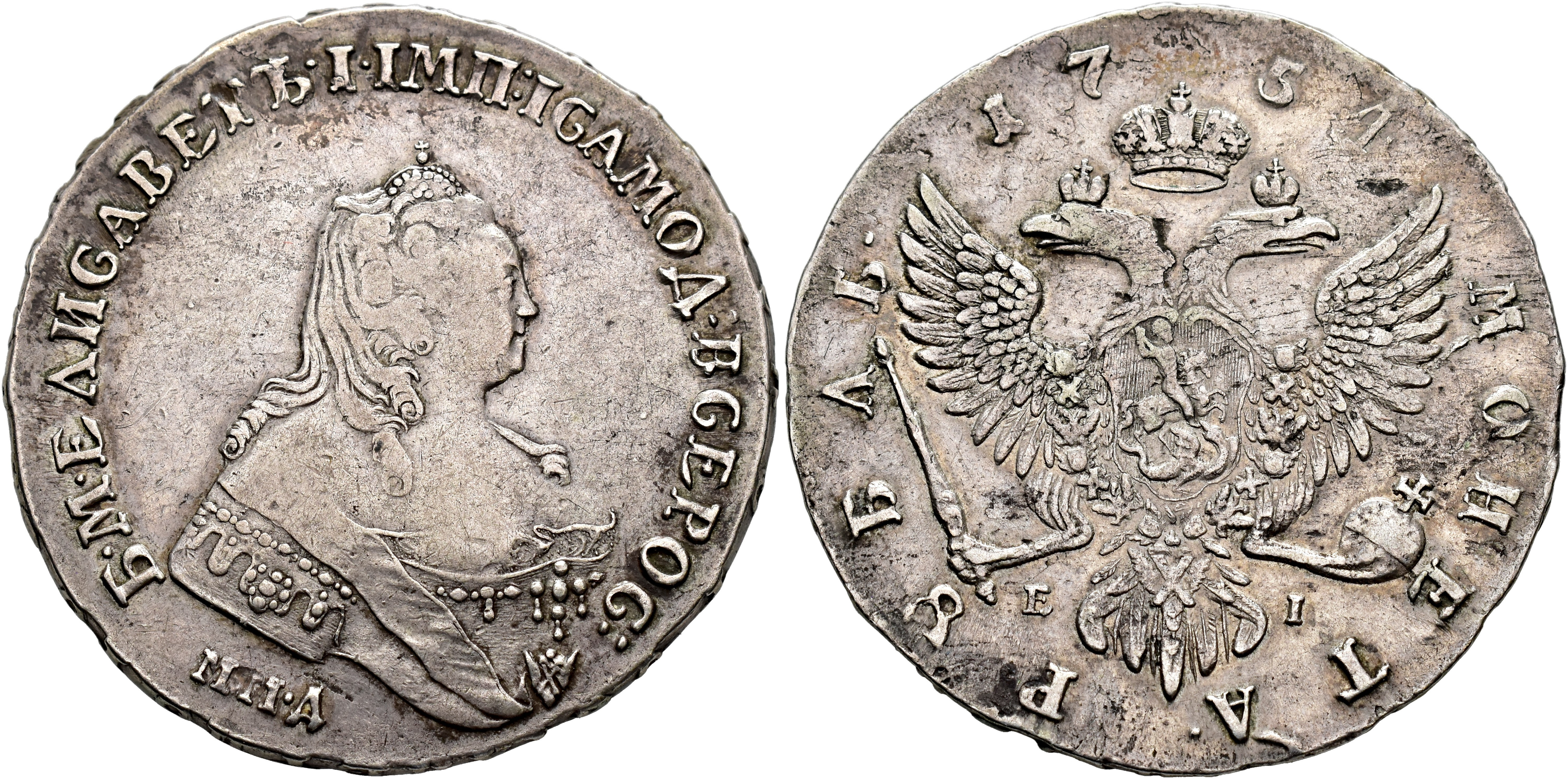 MONEDA EXTRANJERA. RUSIA. Isabel I. Rublo. 1754. MMA/EI. AR 24,73 g. 41,2 mm. KM-19c.1. Hojitas en rev. MBC.