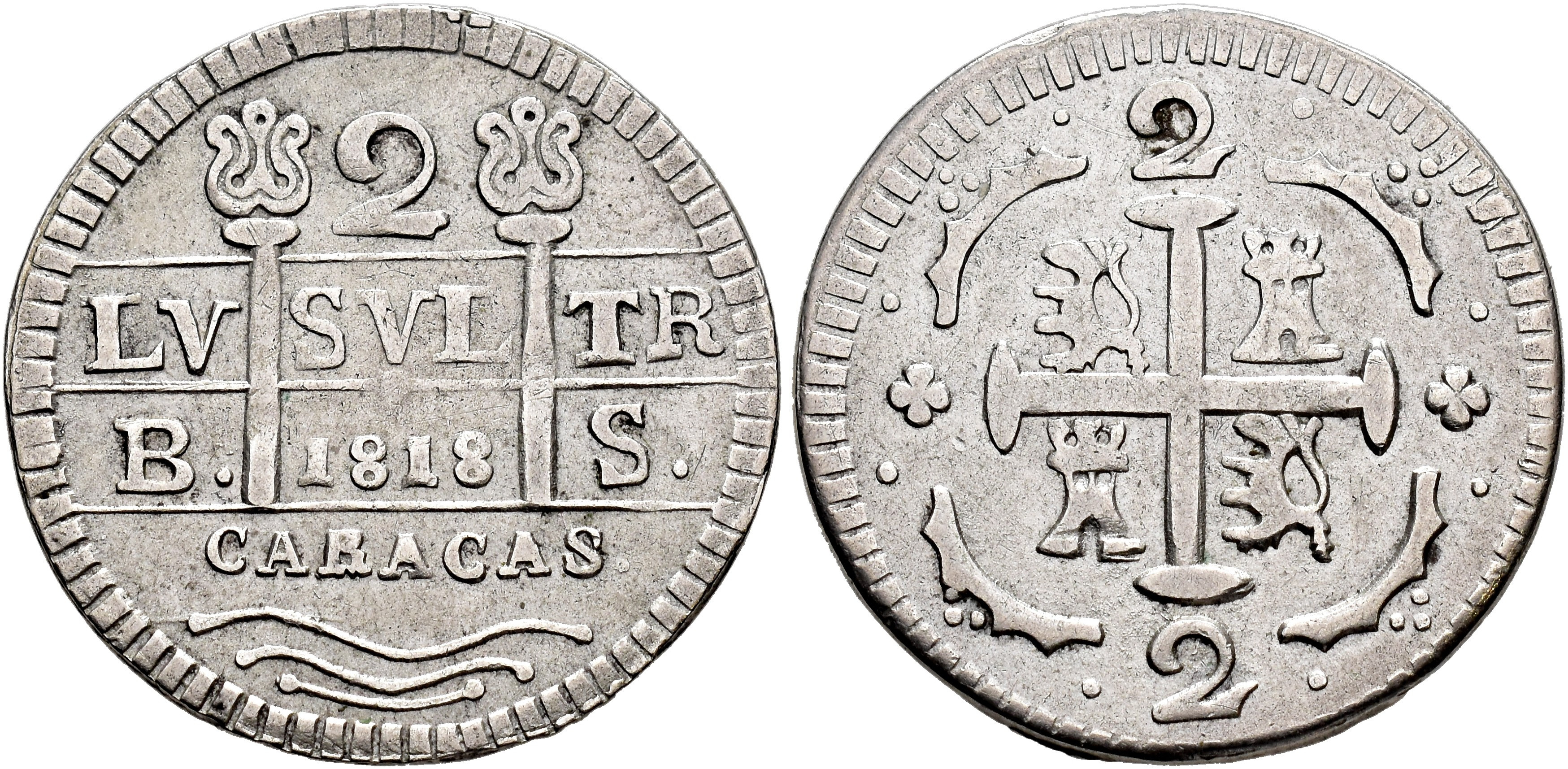 MONEDA EXTRANJERA. VENEZUELA. 2 reales. 1818. Caracas. BS. AR 4,95 g. 23,6 mm. VI-611. MBC.