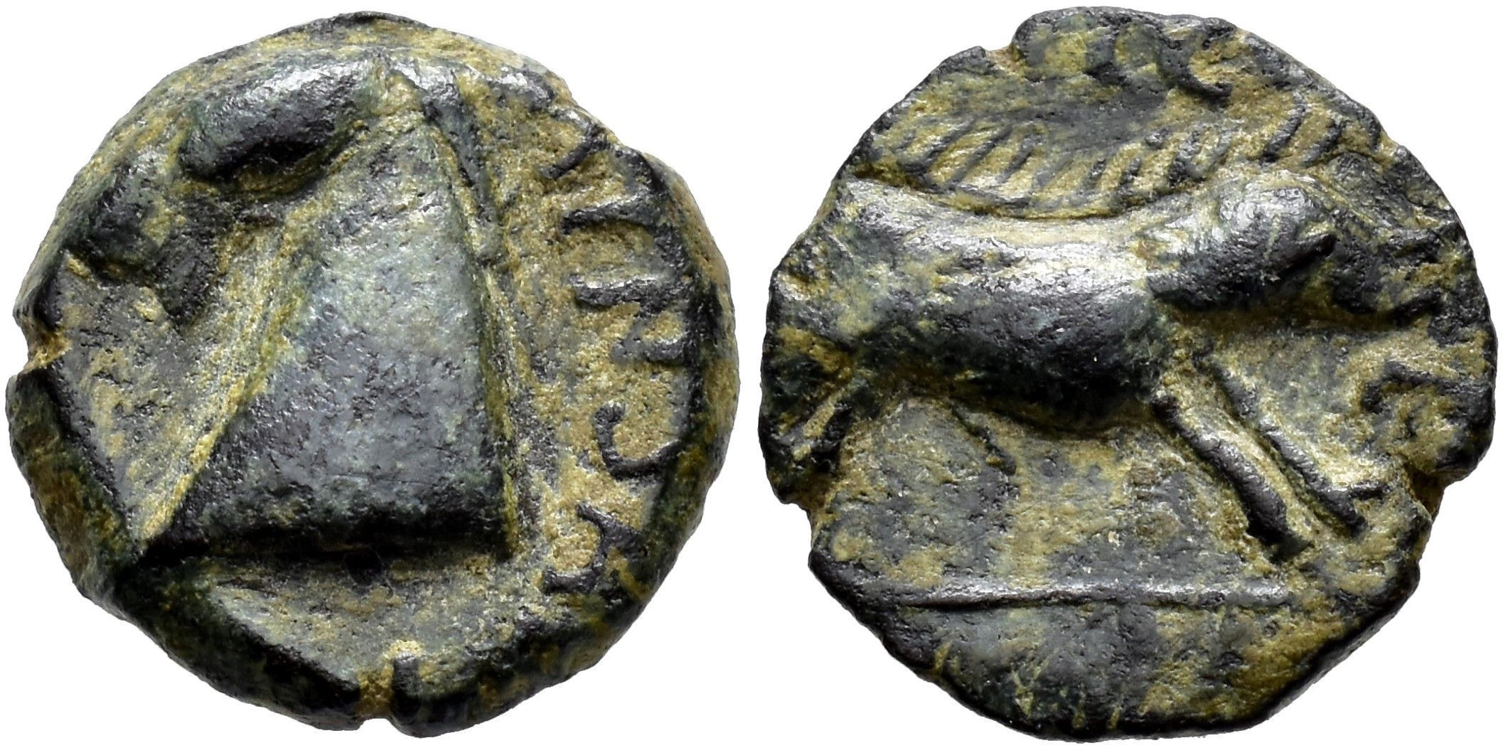 HISPANIA ANTIGUA. OBULCO. Cuadrante. A/ Cabeza de caballo a izq.; detrás interna M INSAN(-). R/ Jabalí a der., encima ley. poco visible SIS(IQV)-E. 2,5 g. 13,8 mm. I-1855; ACIP-2246; CC-2889, mismo ejemplar. Pátina verde oscuro. MBC. Rarísima.