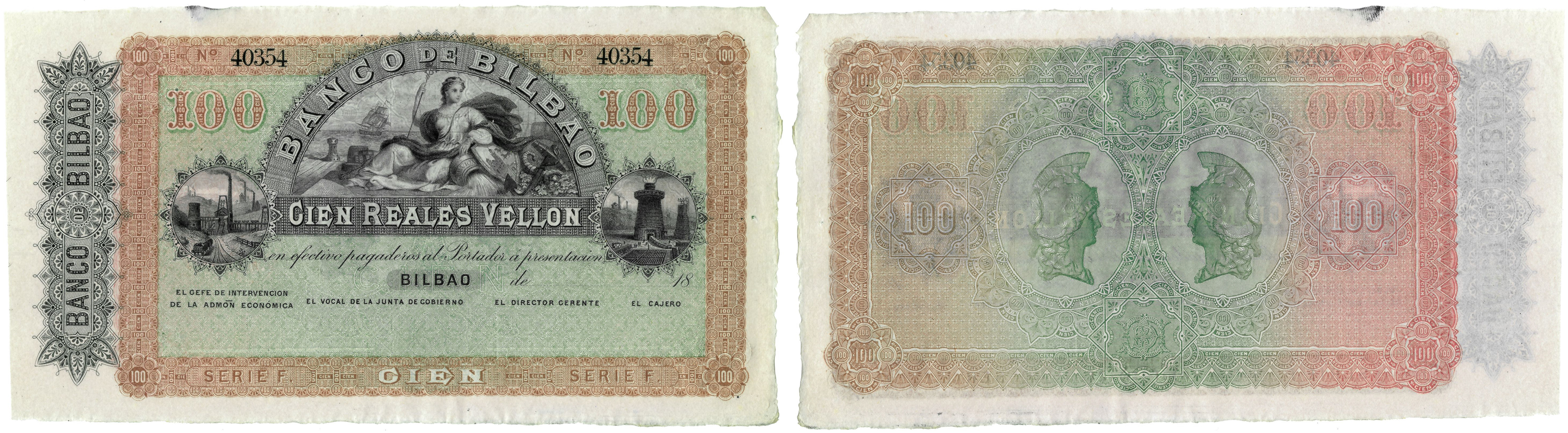 BILLETES ESPAÑOLES. BANCO DE BILBAO. Lote de 2 billetes de 100 reales, 1856c, Serie F, ED-143. Con matriz (recortada) y sin firmas. Pareja correlativa. SC.