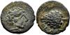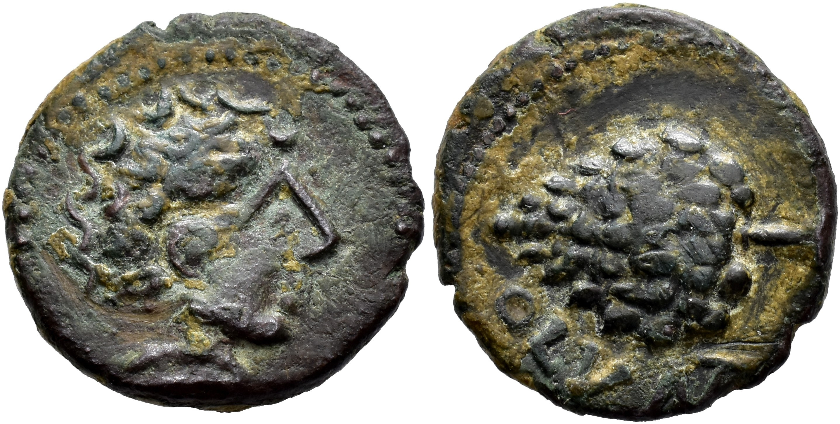 HISPANIA ANTIGUA. OLONTIGI. Mitad. A/ Cabeza masculina a der. R/ Piña a izq., debajo OLVNT. AE 4,86 g. 19,5 mm. I-1881; ACIP-864. Pátina oscura. MBC. Muy rara.