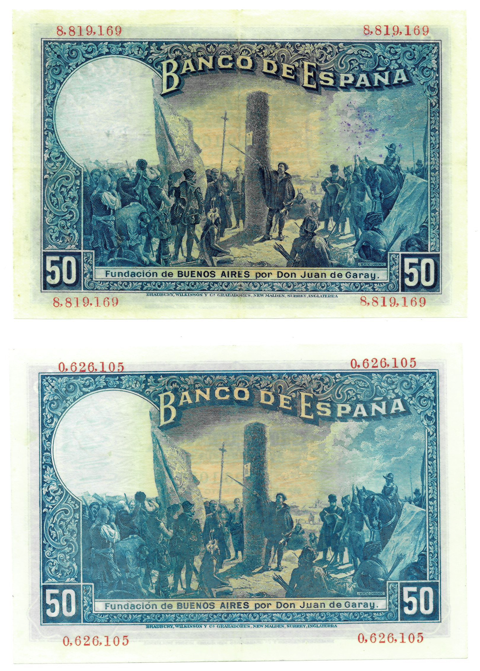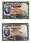 BILLETES ESPAÑOLES. BANCO DE ESPAÑA. Lote de 2 billetes. 50 pesetas, 17 de mayo de 1927, Sin serie, ED-326. Planchado; 50 pesetas, 17 de mayo de 1927, Sin serie, ED-339. Sello húmedo República Española con tinta violeta y en posición vertical. El sin sello, EBC+; con sello, MBC.