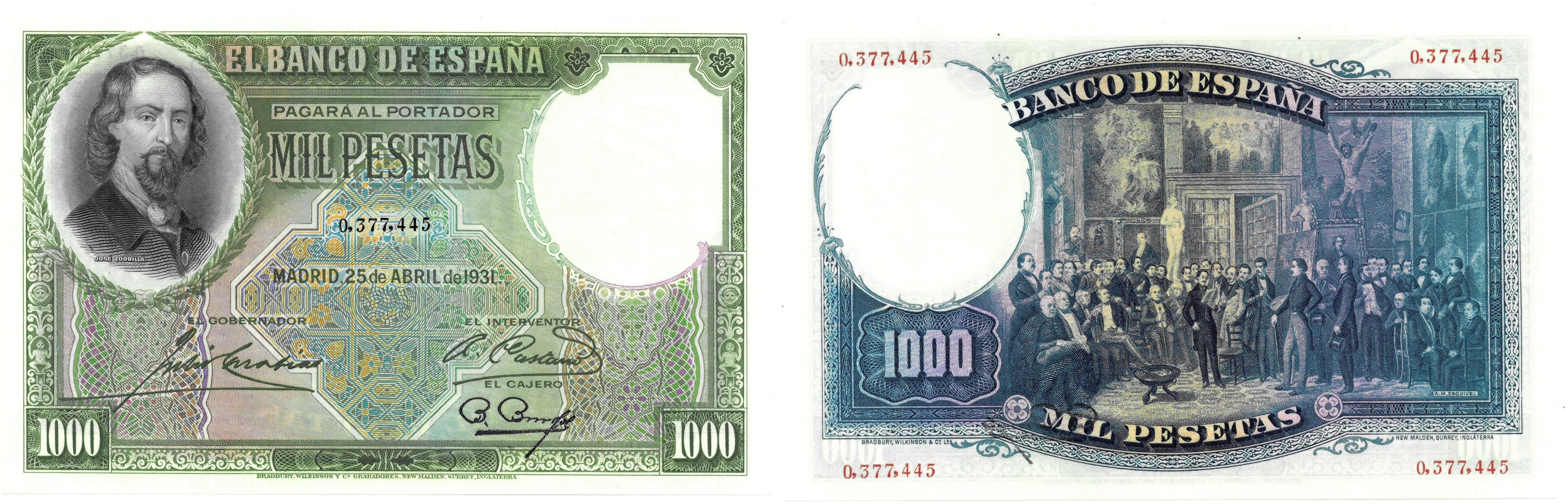 BILLETES ESPAÑOLES. BANCO DE ESPAÑA. 1000 pesetas, 25 de abril de 1931, Sin serie, ED-362. Ligero doblez de mala manipulación. Mantiene todos los relieves. EBC+.