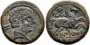HISPANIA ANTIGUA. OILAUNES. As. A/ Cabeza masculina a der., detrás signo ibérico O. R/ Jinete con hoz de guerra a der., debajo OILAUN/ES. AE 11,56 g. 23,9 mm. I-1869; ACIP-1802. Pátina verde. MBC. Muy rara.