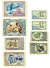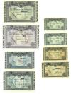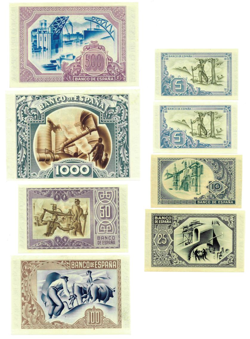 BILLETES ESPAÑOLES. BANCO DE ESPAÑA (BILBAO). Lote de 8 billetes. 5 (2), 10, 25, 50, 100, 500 y 1000 pesetas. 1 de enero de 1937, Sin serie, ED-387/388/389/390/NE26/NE27. Sin numerar. Recortados a partir de pliego. Diversas antefirmas. SC- a SC.