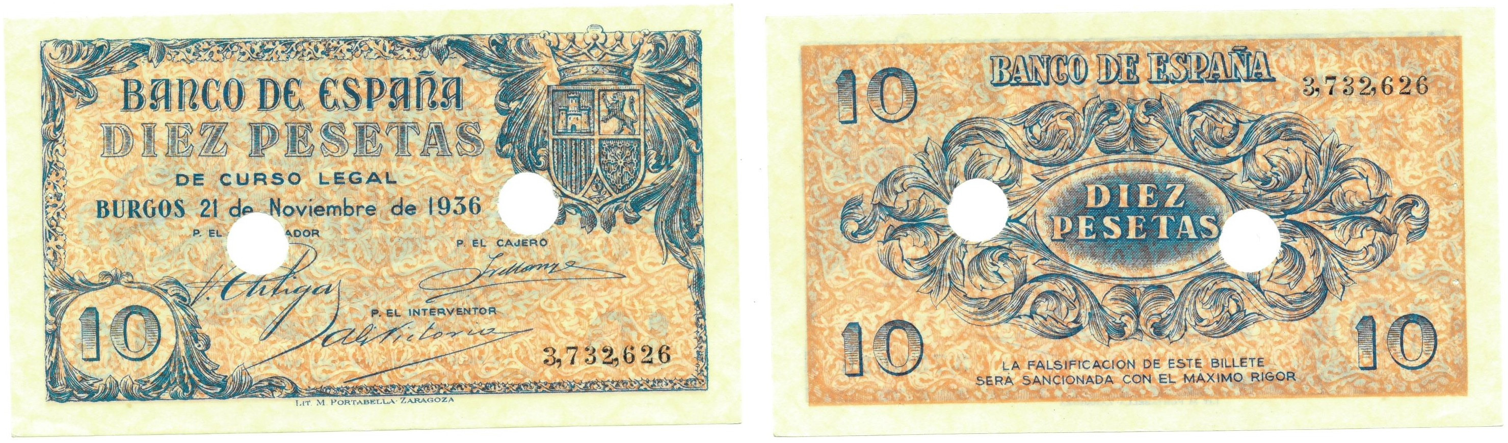 BILLETES ESPAÑOLES. BANCO DE ESPAÑA. 10 pesetas, 21 de noviembre de 1936, Sin serie, ED-418T. Levísima marca de manipulación en una esquina. Inutilizado con dos taladros. SC-.