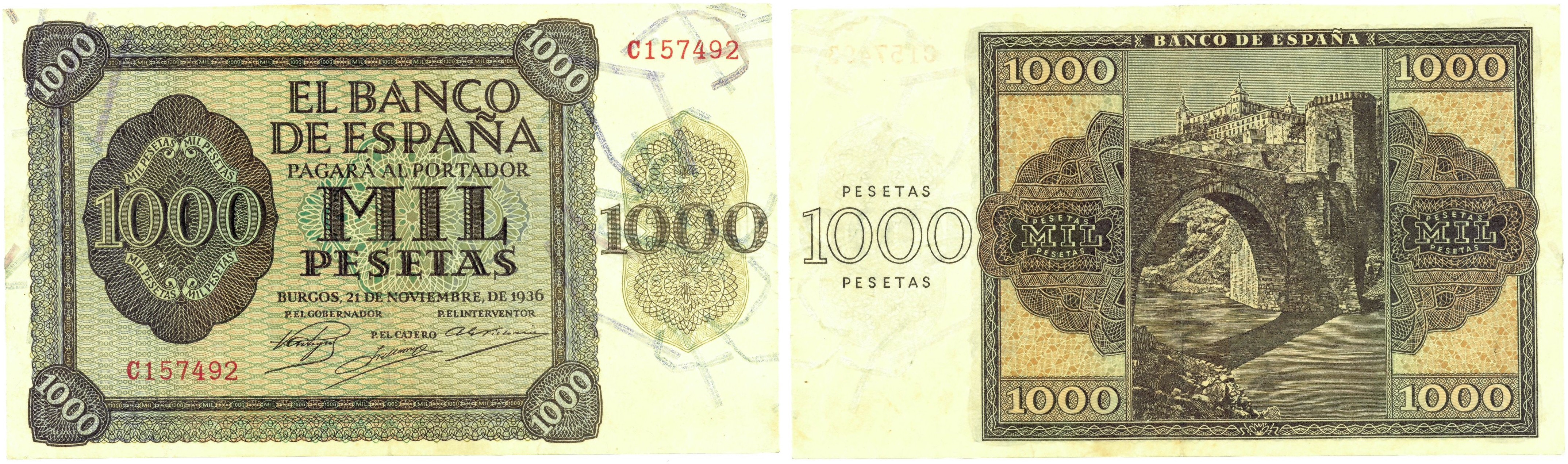 BILLETES ESPAÑOLES. BANCO DE ESPAÑA. 1000 pesetas, 21 de noviembre de 1936, Serie C, ED-423b. Última serie emitida. Planchado. EBC.