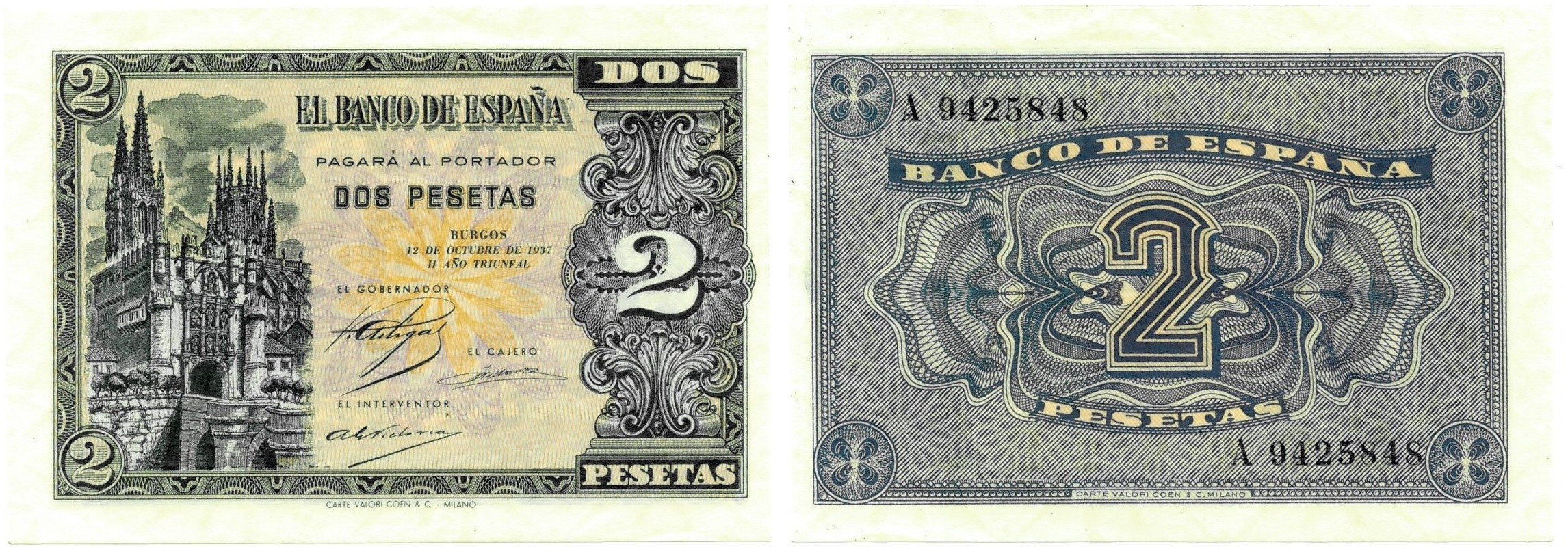 BILLETES ESPAÑOLES. BANCO DE ESPAÑA. 2 pesetas, 12 de octubre de 1937, Serie A, ED-426. Anverso algo descentrado. Levísima muesca de manipulación en margen inferior. SC-.