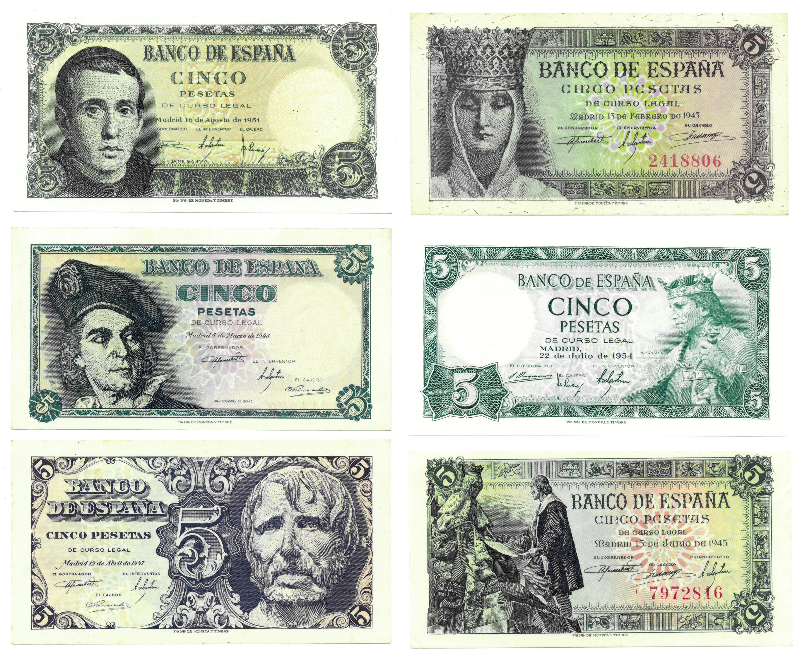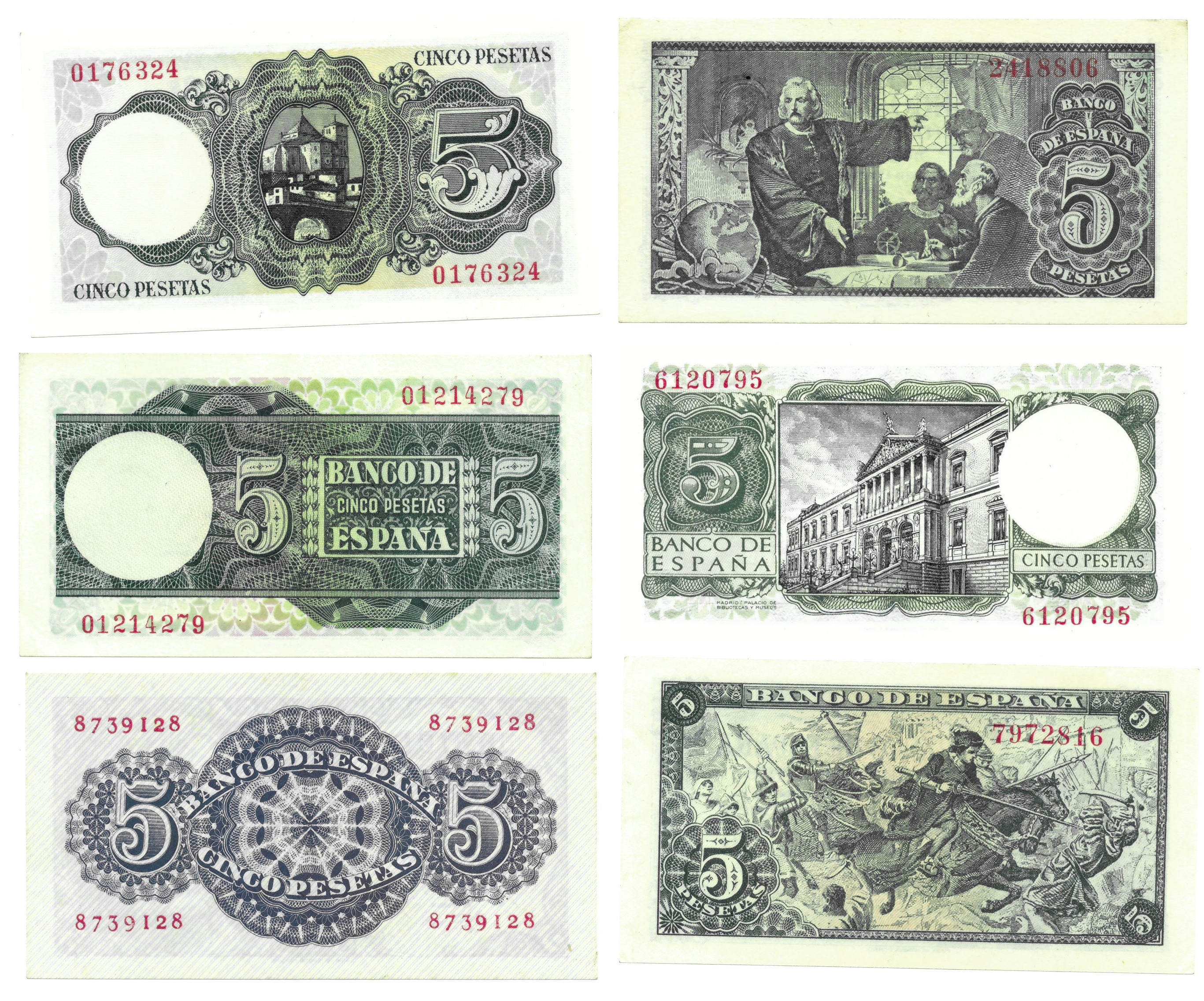 BILLETES ESPAÑOLES. BANCO DE ESPAÑA. Lote de 6 billetes. 5 pesetas, 13 de febrero de 1943, Sin serie, ED-446; 5 pesetas, 15 de junio de 1945, Sin serie, ED-449; 5 pesetas, 12 de abril de 1947, Sin serie, ED-454; 5 pesetas, 5 de marzo de 1948, Sin serie, ED-455; 5 pesetas, 16 de agosto de 1951, Sin serie, ED-459; 5 pesetas, 22 de julio de 1954, Sin serie, ED-466. Pequeñas marcas de manipulación en las 5 pesetas de 1948. Interesante lote de billetes sin letra de serie. EBC+ a SC.