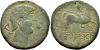 HISPANIA ANTIGUA. URKESKEN.Unidad. A/ Cabeza masculina con collar a der., delante estrella, detrás delfín. R/ Jinete con lanza a der., en exergo URKeSKeN. AE 20,55 g. 32,8 mm. I-1906; ACIP-2103. Perforación. Pátina verde. BC+. Rara.