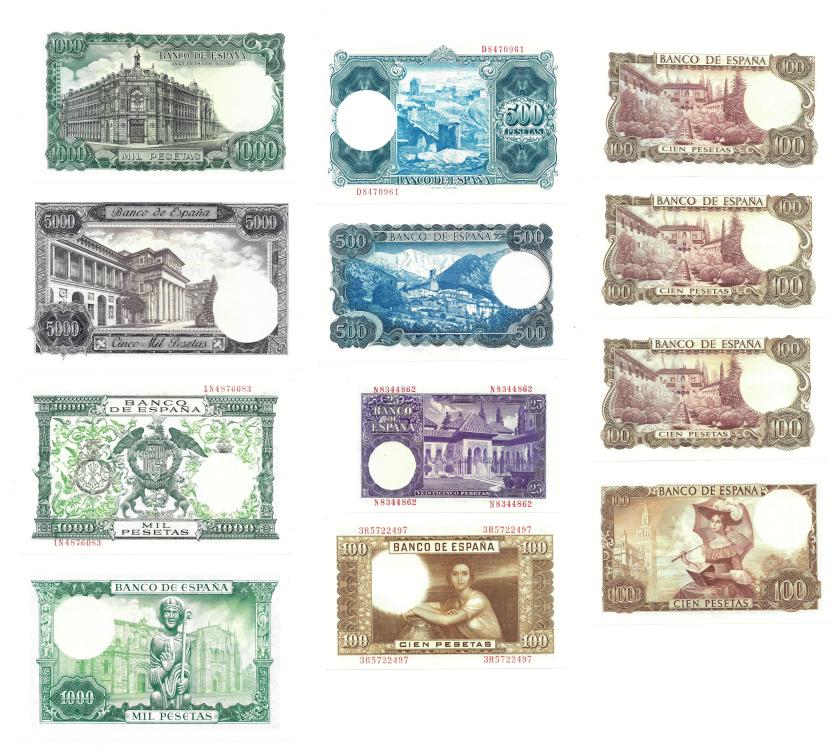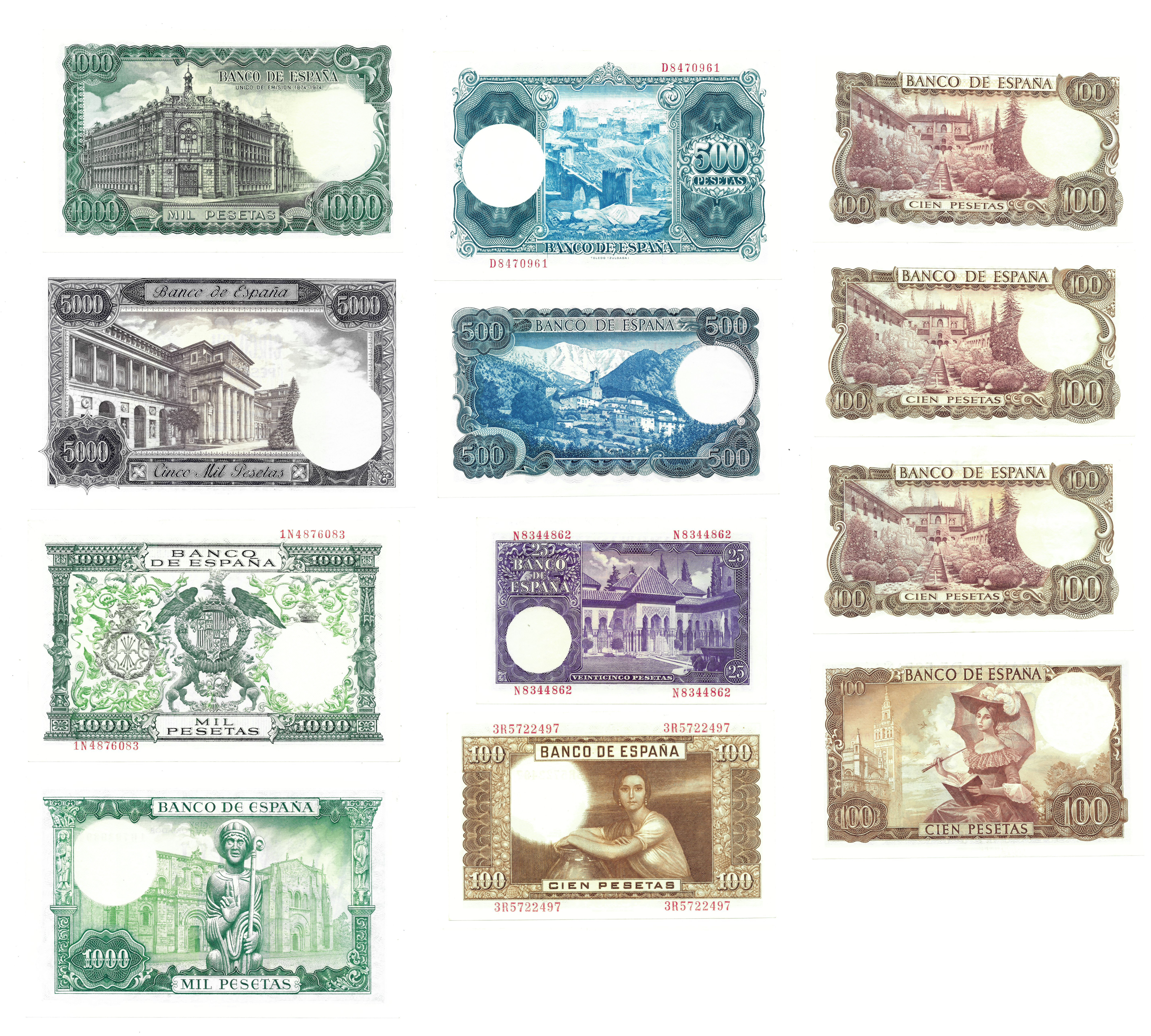 BILLETES ESPAÑOLES. BANCO DE ESPAÑA. Lote de 12 billetes: 100 pesetas, 7 de abril de 1953, Serie 3R, ED-464c. Planchado. Leves marcas de manipulación; 25 pesetas, 22 de julio de 1954, Serie N, ED-467a. Suave picotazo en la ventana; 500 pesetas, 22 de julio de 1954, Serie D, ED-468b; 1000 pesetas, 29 de noviembre de 1957, Serie 1N, ED-469b. Mínimas marcas de manipulación; 100 pesetas, 19 de noviembre de 1965, Serie Q, ED-470a. Leves marcas de manipulación; 1000 pesetas, 19 de noviembre de 1965, Serie 1H, ED-471; 100 pesetas, 17 de noviembre de 1970, Serie 7G, ED-472b; 100 pesetas, 17 de noviembre de 1970, Serie 7V, ED-472b. Pareja correlativa; 500 pesetas, 23 de julio de 1971, Serie 1J, ED-473a; 1000 pesetas, 17 de septiembre de 1971, Serie 6C, ED-474c. Ligeramente descentrado; 5000 pesetas, 6 de febrero de 1976, Serie X, ED-475a. Minúsculas marcas de manipulación en un margen. A EXAMINAR. EBC+ a SC.