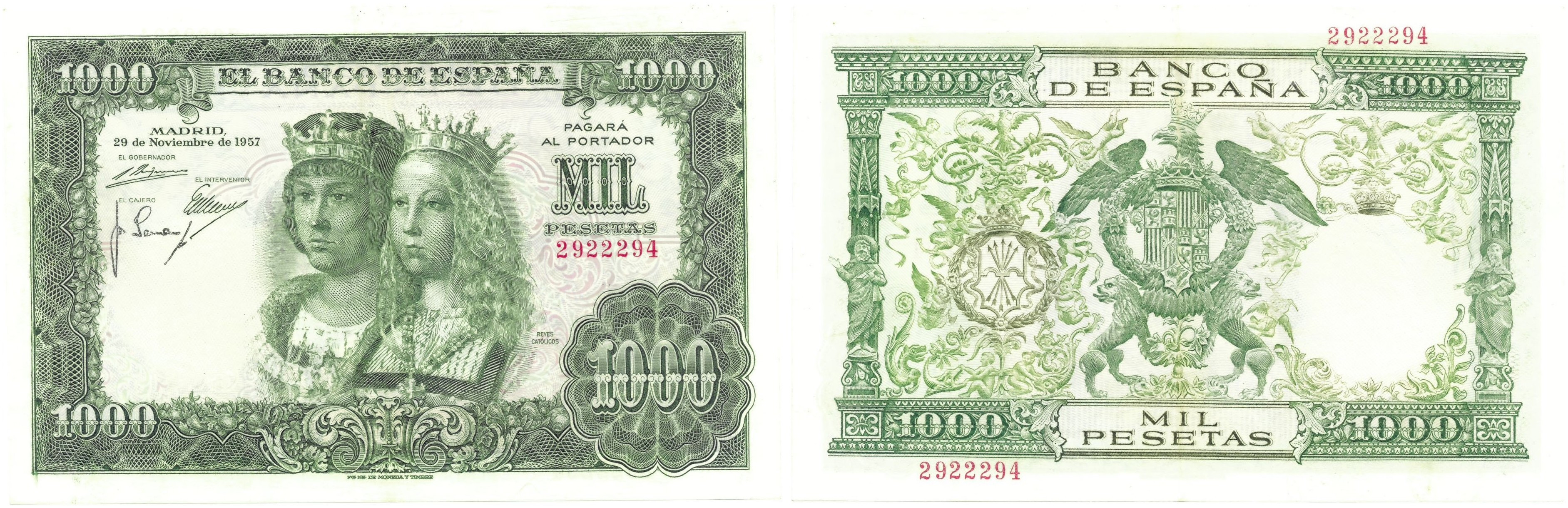 BILLETES ESPAÑOLES. BANCO DE ESPAÑA. 1000 pesetas, 29 de noviembre de 1957, Sin serie, ED-469. Planchado. EBC+.