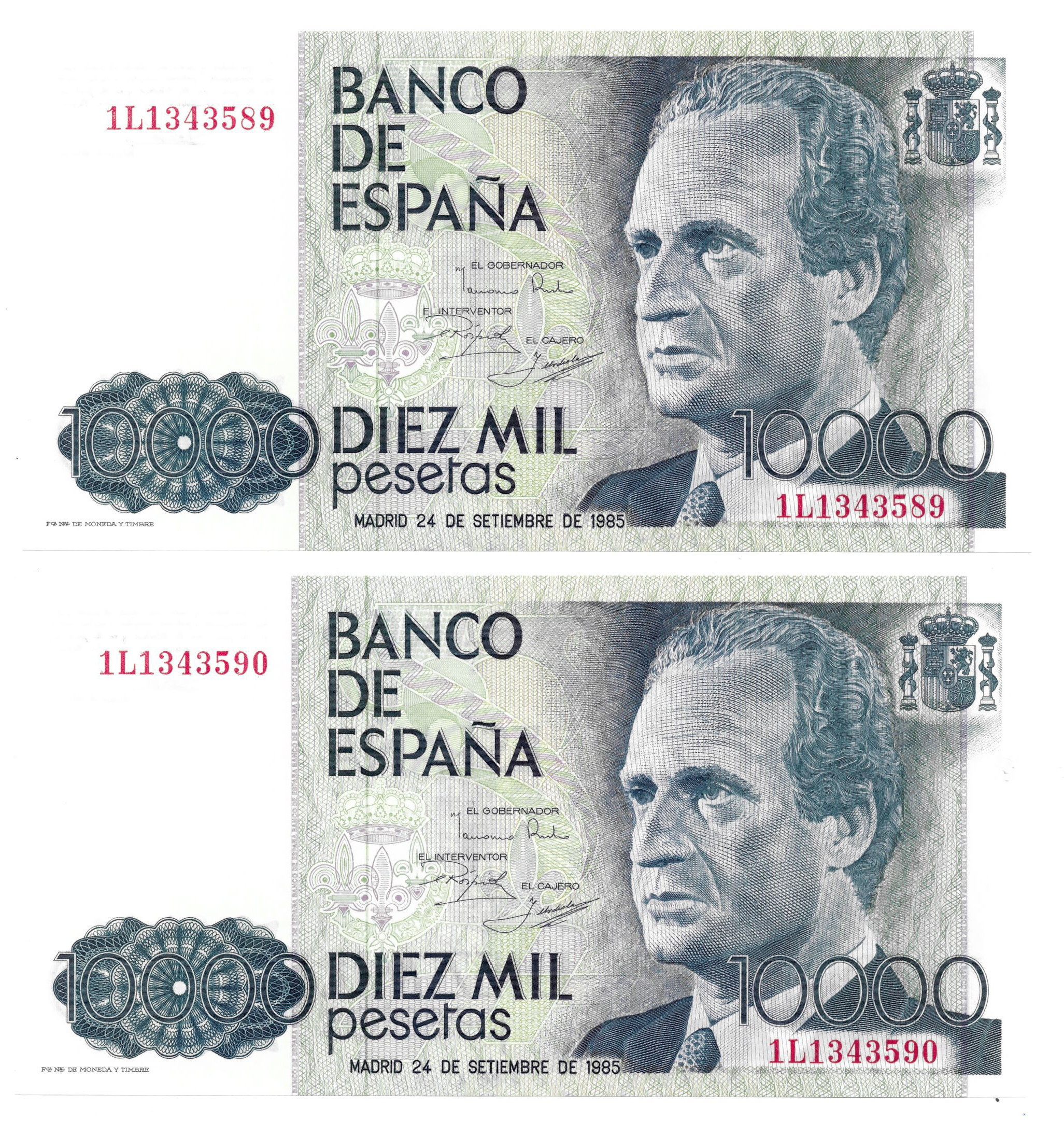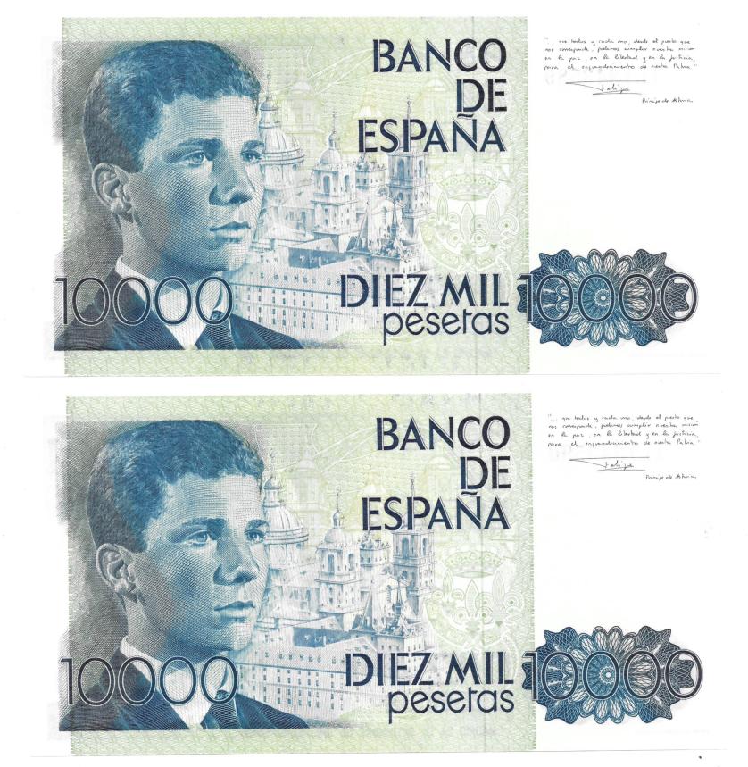 BILLETES ESPAÑOLES. BANCO DE ESPAÑA. 10000 pesetas, 24 de septiembre de 1985, Serie 1L, ED-481a. Pareja correlativa. SC.