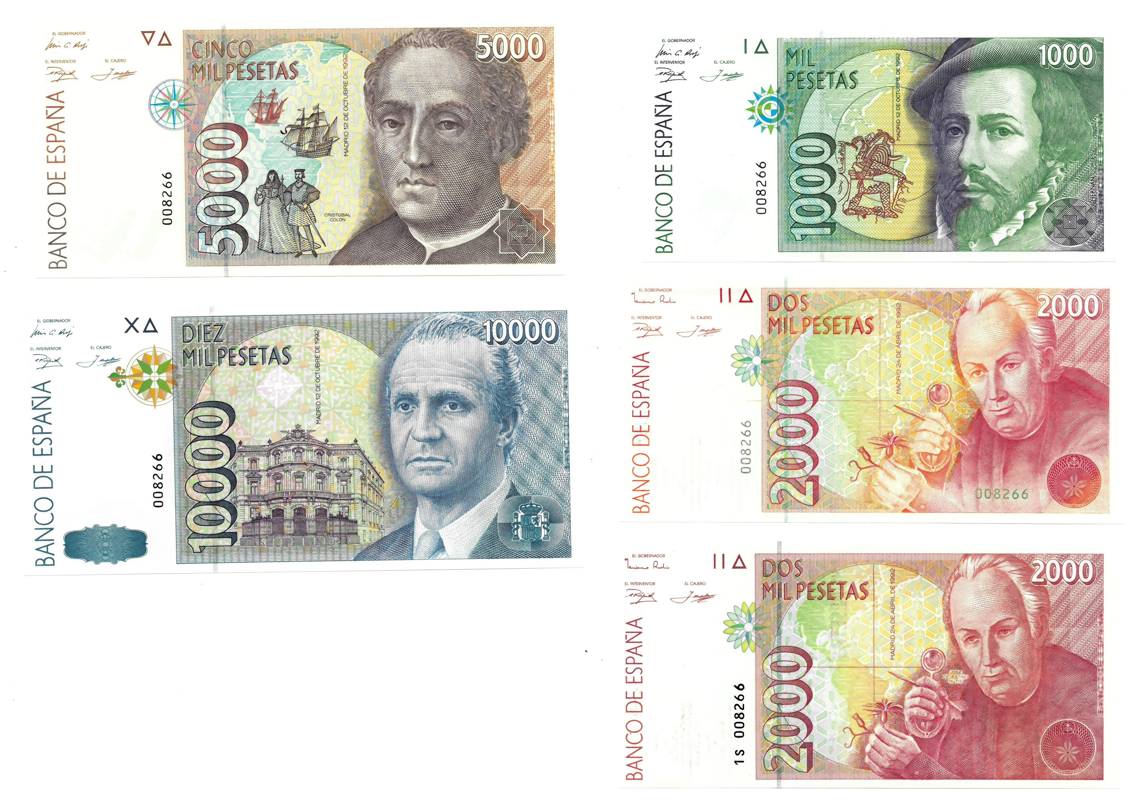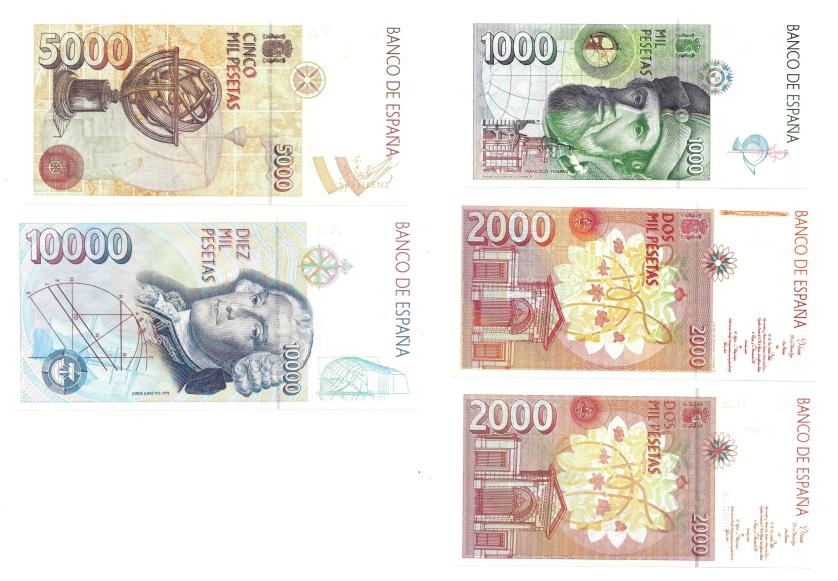 BILLETES ESPAÑOLES. BANCO DE ESPAÑA. Lote de 5 billetes: 1000 pesetas, 12 de octubre de 1992, Sin serie, ED-483; 2000 pesetas, 24 de abril de 1992, Sin serie, ED-482; 5000 pesetas, 12 de octubre de 1992, Sin serie, ED-484; 10000 pesetas, 12 de octubre de 1992, Sin serie, ED-485. Todos con la misma numeración. SC.