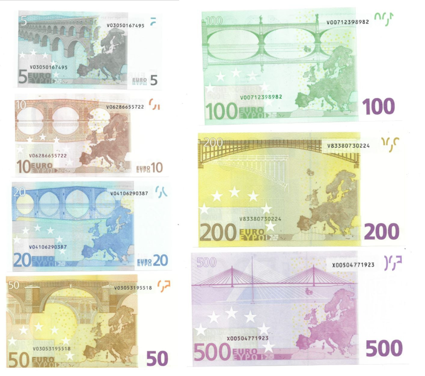BILLETES ESPAÑOLES. BANCO DE ESPAÑA. Lote de 7 billetes. 5, 10, 20, 50, 100, 200 y 500 euros, 2002. Todos Serie V (España), excepto el 500 euros que es Serie X (Alemania). ED-488. Firma de Duisenberg. SC.