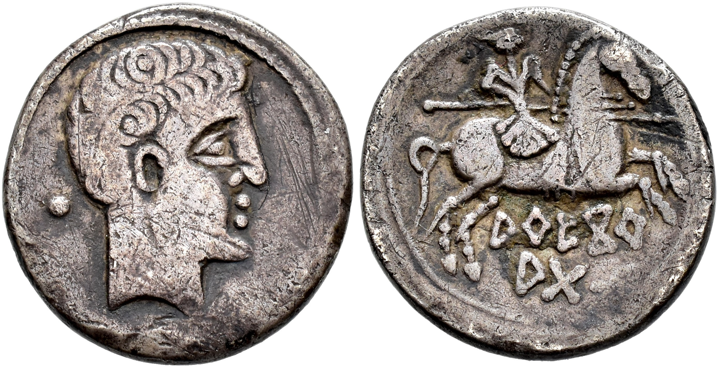 HISPANIA ANTIGUA. AREKORATAS. Denario. A/ Cabeza masculina a der., detrás glóbulo. R/ Jinete lancero a der., debajo AREKoR/ATaS. AR 3,85 g. 18,8 mm. I-109; ACIP-1764; CC-2048, mismo ejemplar. No más de 5 ejemplares conocidos. Rayas. MBC-. Rarísima.