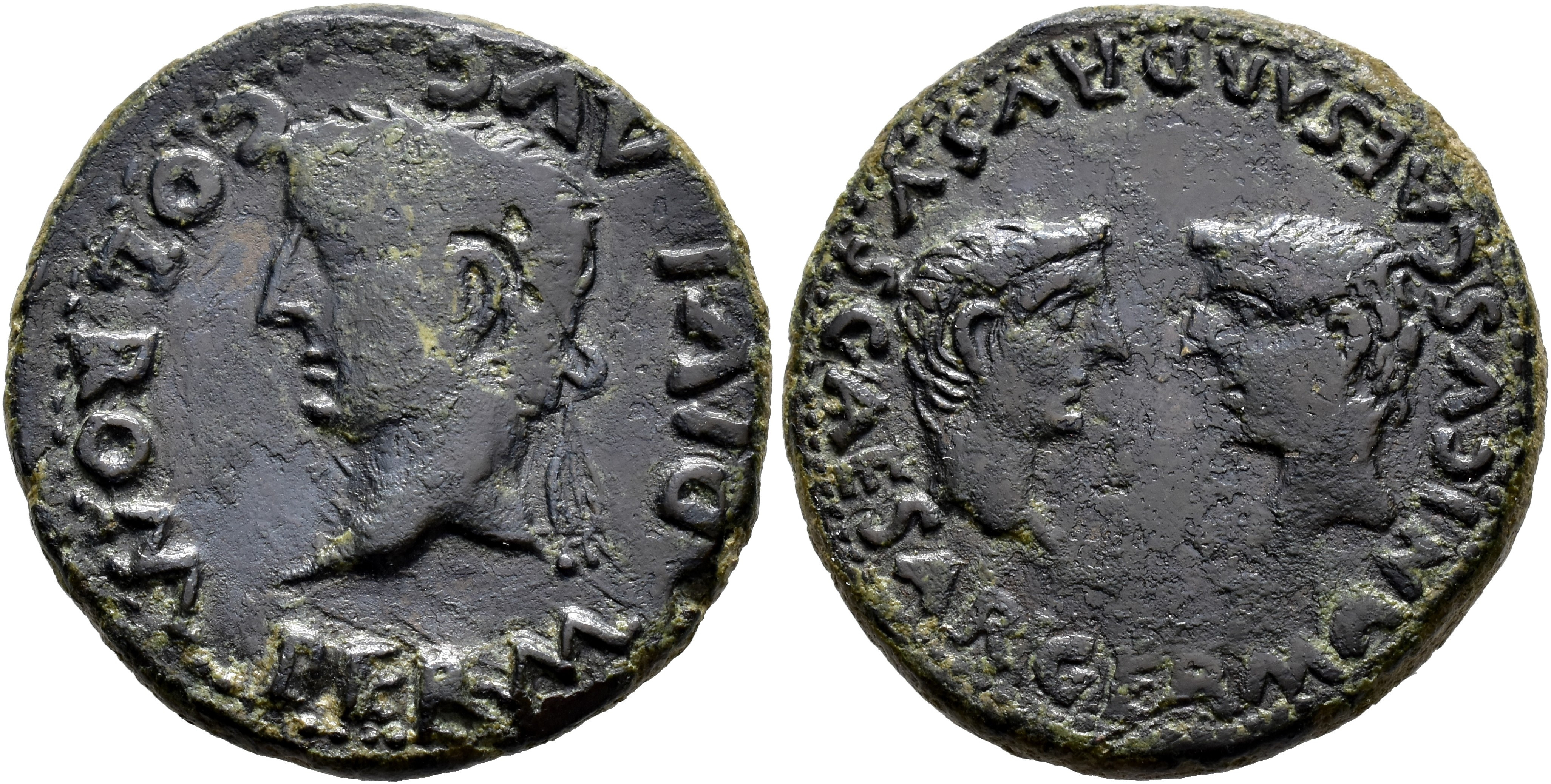 HISPANIA ANTIGUA. COLONIA ROMULA. Tiberio. As. A/ Cabeza laureada a izq.; PERM DIVI AVG COL ROM. R/ Cabezas afrontadas de Germánico y Druso; GERMANICVS CAESAR DRVSVS CAESAR. AE 13,74 g. 28,3 mm. I-2016; APRH-74; ACIP-3361. Pátina oscura. MBC-/MBC.