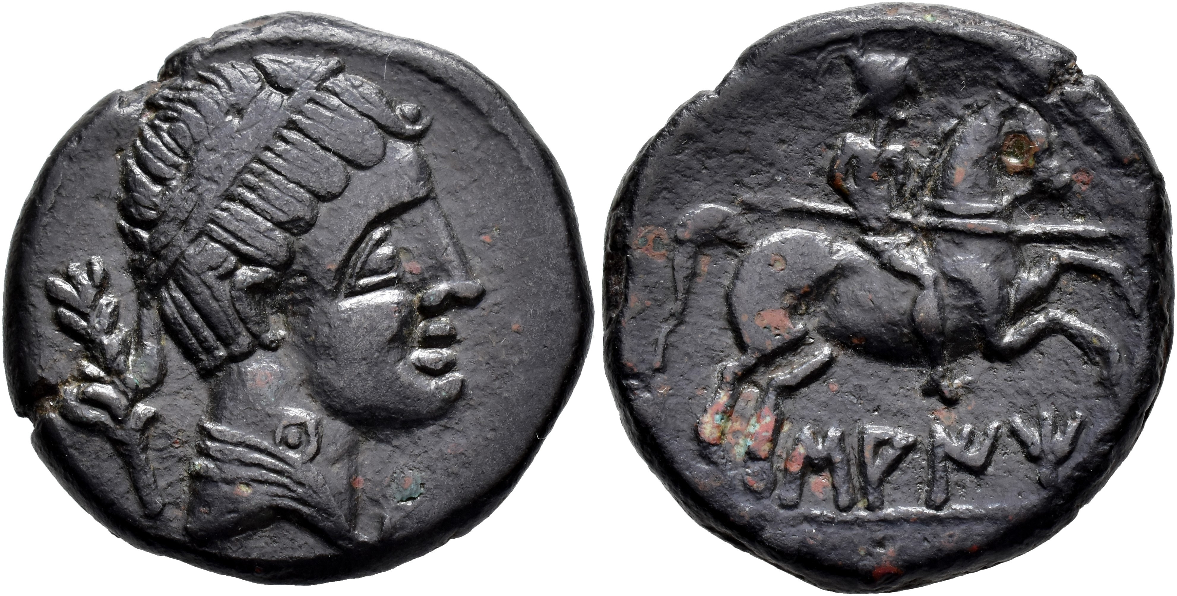 HISPANIA ANTIGUA. SAITI. Unidad. A/ Cabeza diademada con manto y fíbula a der., detrás palma. R/ Jinete con lanza a der., debajo sobre línea SAITi. AE 13,53 g. 26,8 mm. I-2100; ACIP-2031. Bonita pátina oscura con tonos rojos. MBC+.