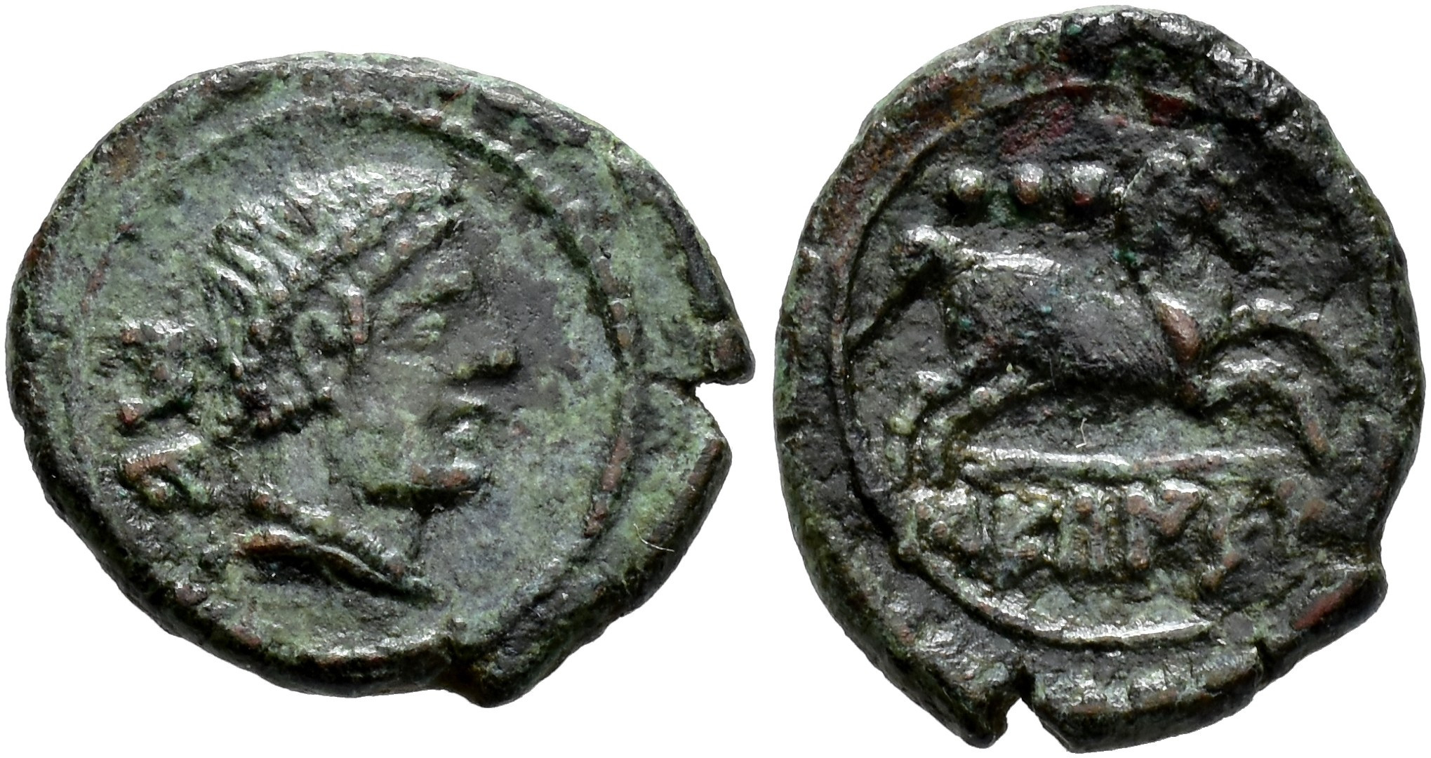HISPANIA ANTIGUA. SEKAISA. Cuarto. A/ Cabeza masculina diademada a der., detrás SE. R/ Caballo galopando a der., encima tres glóbulos, bajo línea SEKaISA. AE 1,6 g. 14,7 mm. I-2150; ACIP-1546. Pátina verde. MBC+. Muy rara.