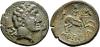 HISPANIA ANTIGUA. SEKAISA. Unidad. A/ Cabeza masculina a der., delante delfín, detrás signos ibéricos SE. R/ Jinete lancero a der., en exergo SEKaISA. AE 8,66 g. 25,4 mm. I-2138; ACIP-1557. Pequeñas erosiones. Pátina verde oscuro. MBC/MBC+. Rara.