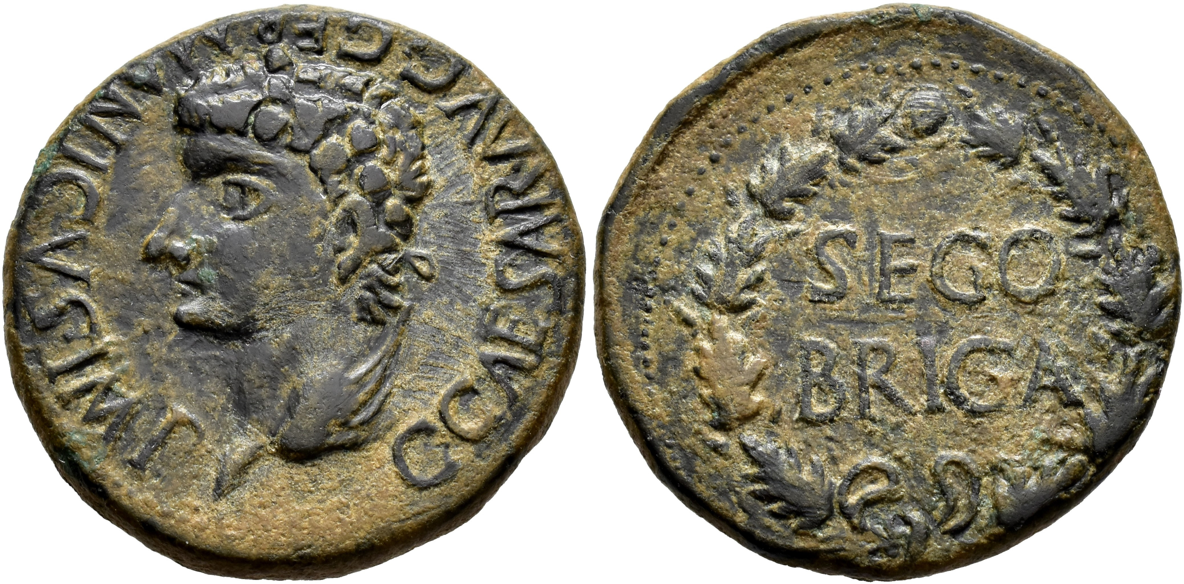HISPANIA ANTIGUA. SEGOBRIGA. Calígula. As. A/ Cabeza laureada a izq.; C CAESAR AVG GERMANICVS IMP. R/ SEGO/BRIGA dentro de corona cívica. AE 11,26 g. 28,4 mm. I-2191; APRH-476; ACIP-3246. Pátina oscura. MBC/MBC+.