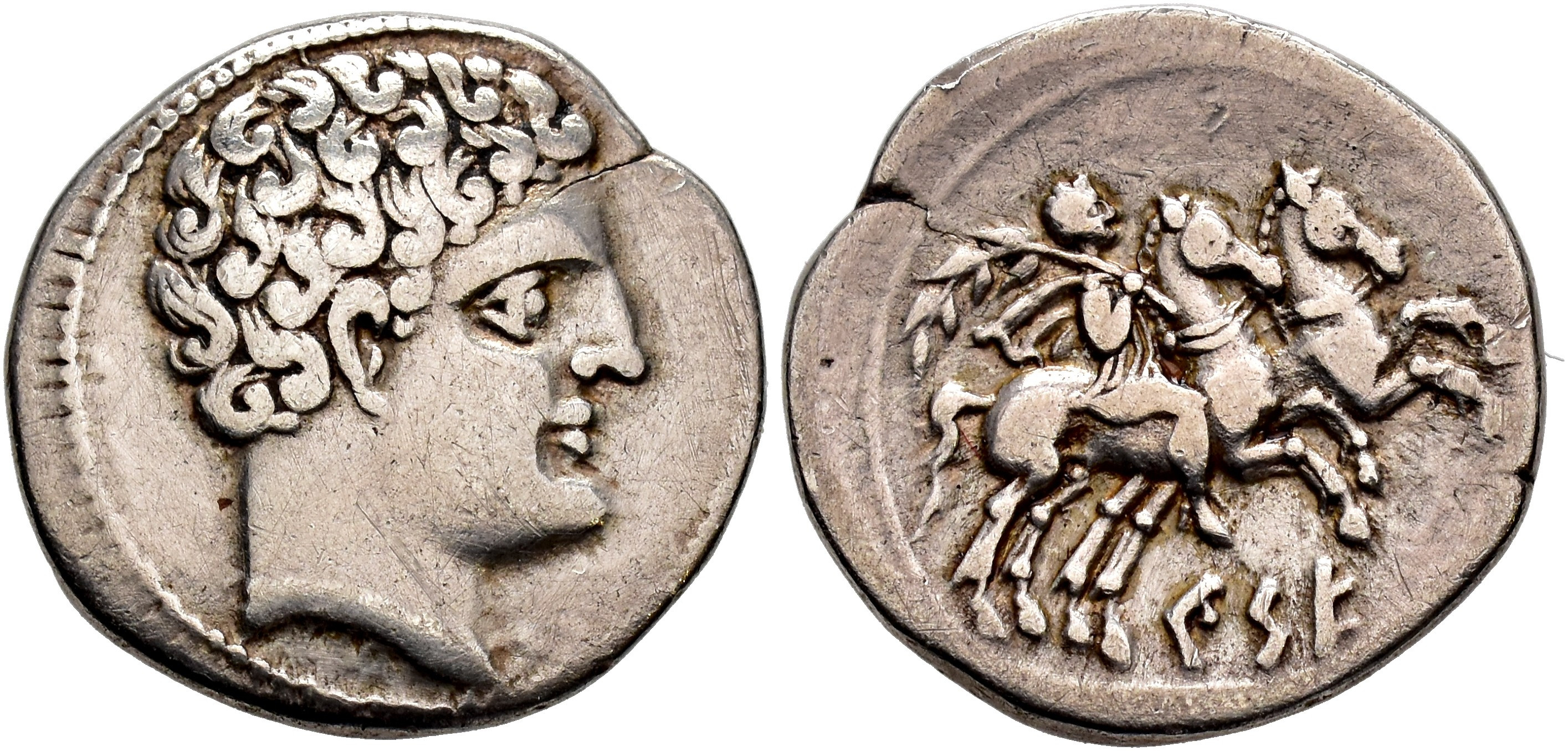 HISPANIA ANTIGUA. KESE. Denario. A/ Cabeza masculina a der. R/ Jinete con palma y dos caballos a der., debajo KeSE. AR 3,96 g. 18,9 mm. I-2267; ACIP-1123. Finas rayitas y pequeña grieta. MBC. Escasa.