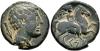 HISPANIA ANTIGUA. KESE. Unidad. A/ Cabeza masculina con manto y fíbula a der., detrás punta de lanza. R/ Jinete con palma a der., debajo sobre línea KeSE. AE 11,15 g. 24,3 mm. I-2284; ACIP-1146. Bonita pátina verde con pequeñas erosiones. MBC.