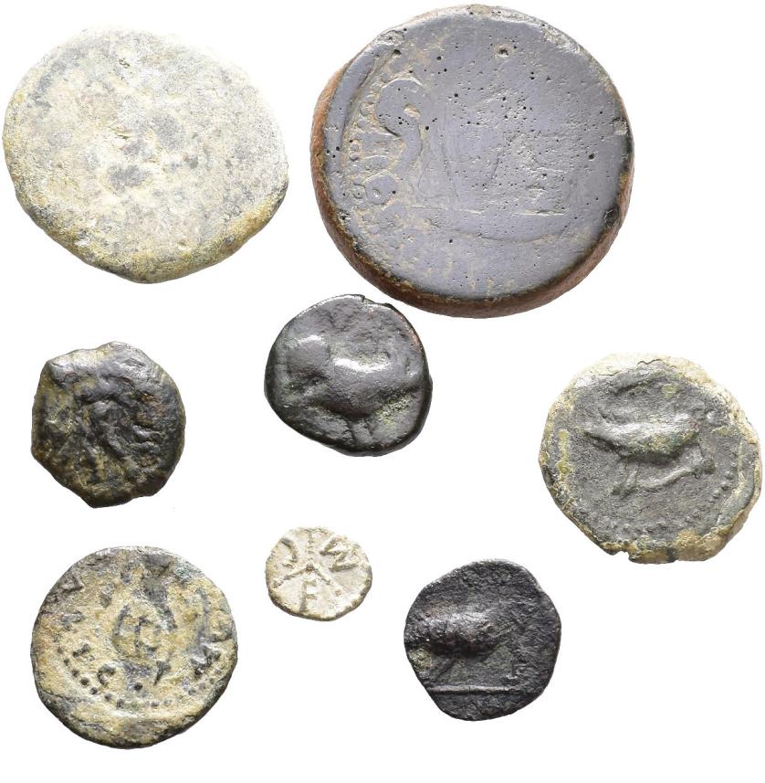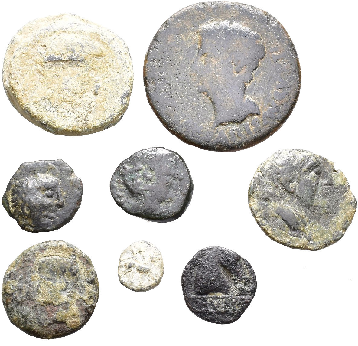 HISPANIA ANTIGUA. Lote de 8 piezas de la Ulterior y Bética: 2 plomos monetiformes, 4 cuadrantes (Nabrissa, Obulco, Osset e Italica), 1 semis serie jabalí-clava y un dupondio de Ebora de Augusto. RC/BC+.