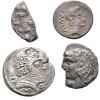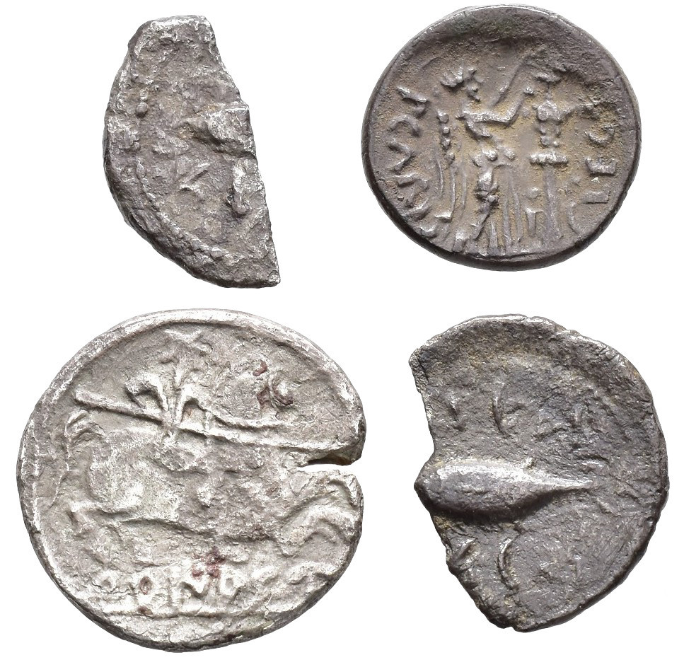HISPANIA ANTIGUA. Lote de 4 piezas: 1 denario forrado de Turiasu, 1 quinario de Augusto Emerita, 1 fragmento de dracma de Gadir y 1 hemidracma fragmentada de Gadir. BC/MBC.