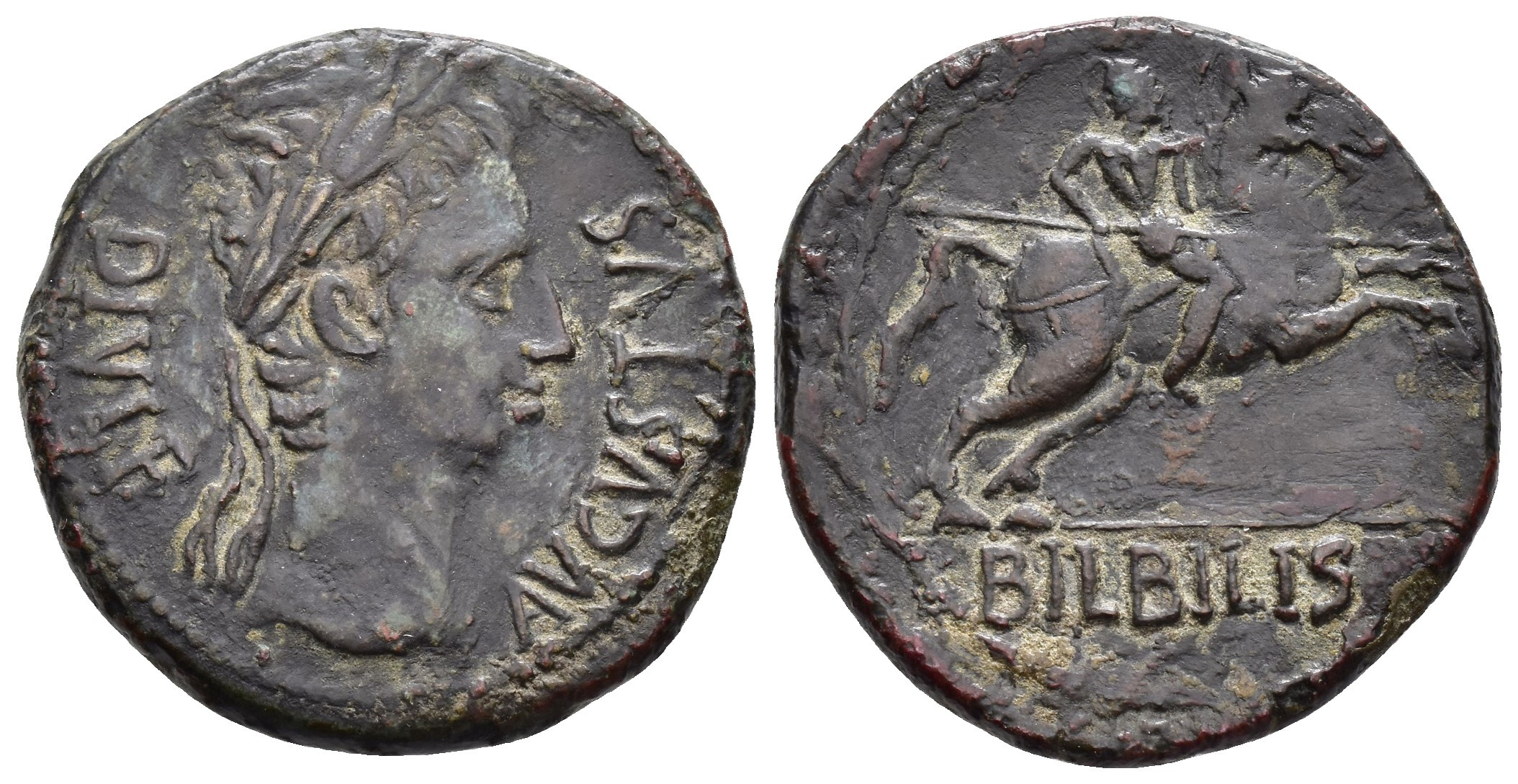 HISPANIA ANTIGUA. BILBILIS. Augusto. As. A/ Cabeza laureada a der.; AVGVSTVS DIVI F. R/ Jinete lancero a der., en exergo BILBILIS. AE 12,37 g. 28,7 mm. I-275; APRH-391; ACIP-3016. Campos ligeramente repasados. Pátina oscura. MBC+/MBC.