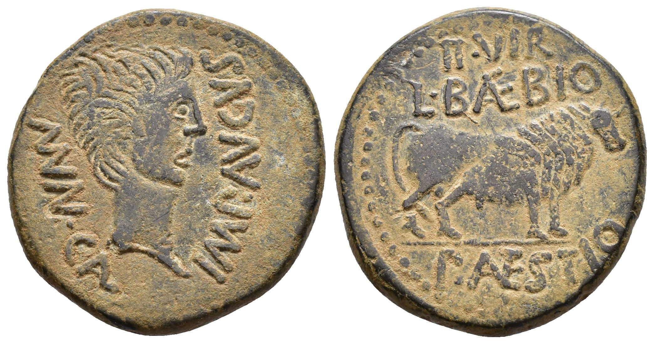 HISPANIA ANTIGUA. CALAGURRIS. Augusto. As. A/ Cabeza a der.; delante IMP AVGVS -MNV CAL. R/ Toro a der.; encima L BAEBIO/ P ANTESTIO. AE 13,04 g. 28,7 mm. I-413; APRH-439; ACIP-3120. Pátina oscura terrosa. MBC-.