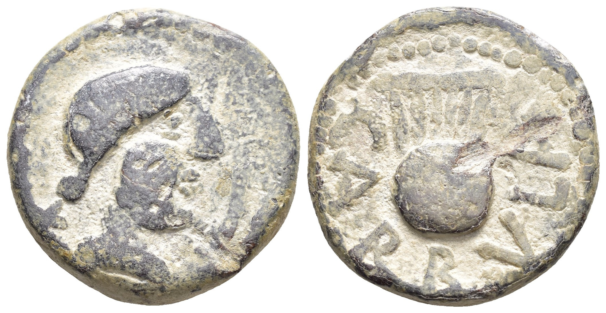 HISPANIA ANTIGUA. CARBULA. Plomo monetiforme. A/ Cabeza femenina con moño a der., detrás X. R/ Lira; CARBVLA. Pb 28,49 g. 28,4 mm. Golpe en rev. CCP-p.3.1. BC+/MBC-.
