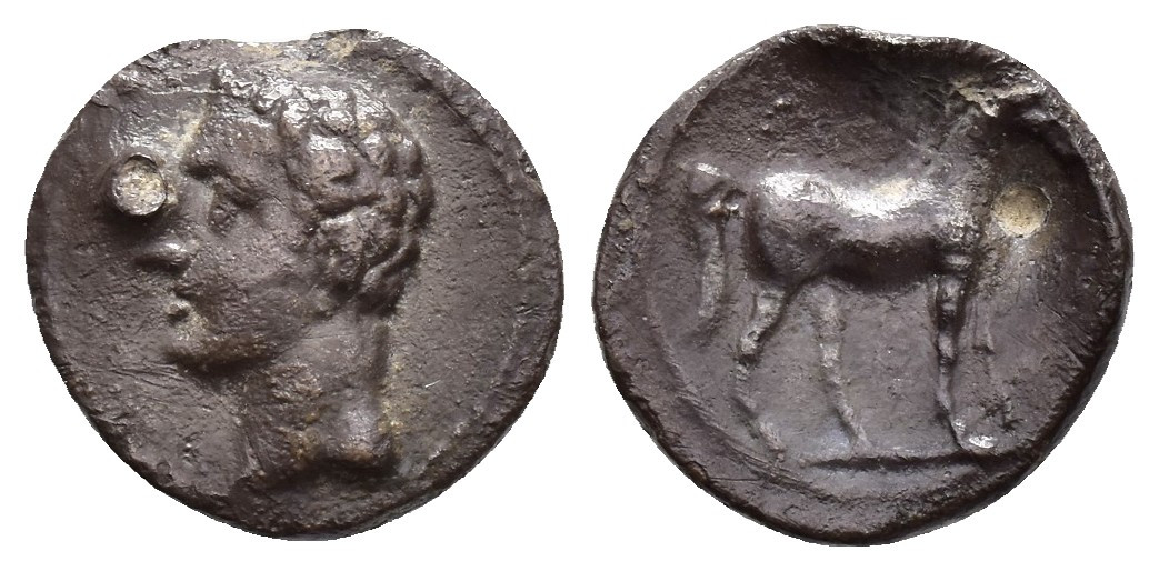 HISPANIA ANTIGUA. EMISIONES HISPANO-CARTAGINESAS. 1/4 siclo. A/ Cabeza masculina a izq. R/ Caballo parado a der. AR 1,66 g. 13,7 mm. I-545; ACIP-605. Agujero tapado. MBC. Escasa.