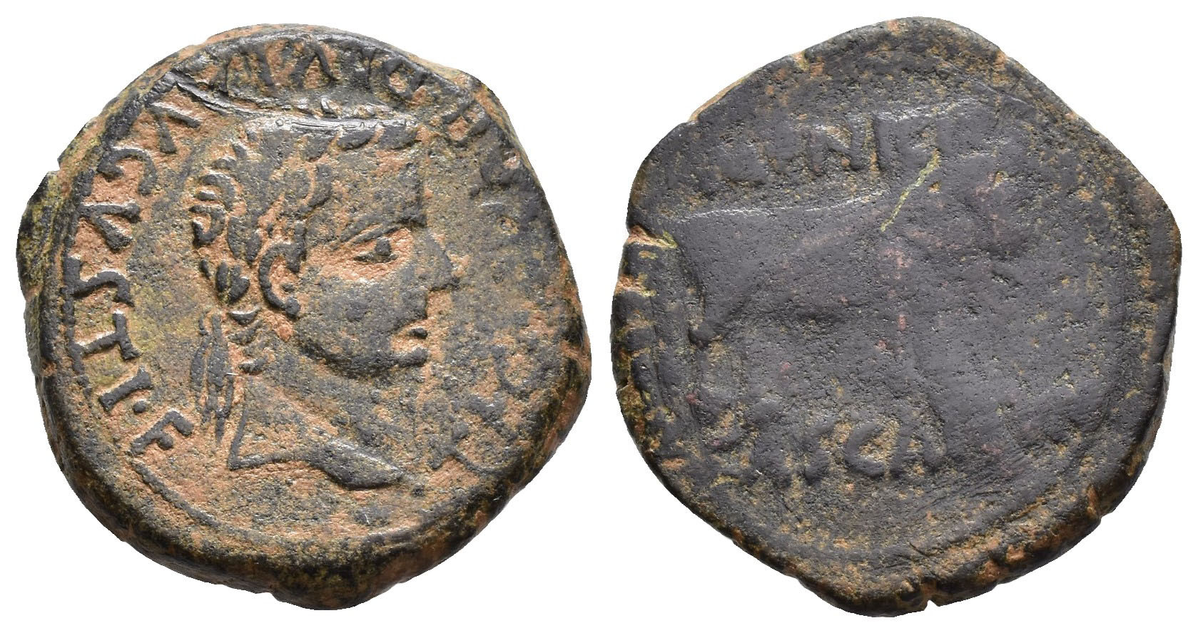 HISPANIA ANTIGUA. CASCANTUM. Tiberio. Semis. A/ Cabeza laureada a der.; TI C(AE)SAR DIVI AVGVSTI F. R/ Toro a der.; MVNICIP/CASCA(NT)VM. AE 8,55 g. 23 mm. I-693; APRH-428; ACIP-3160. Pátina verde. MBC-/RC. Rara.